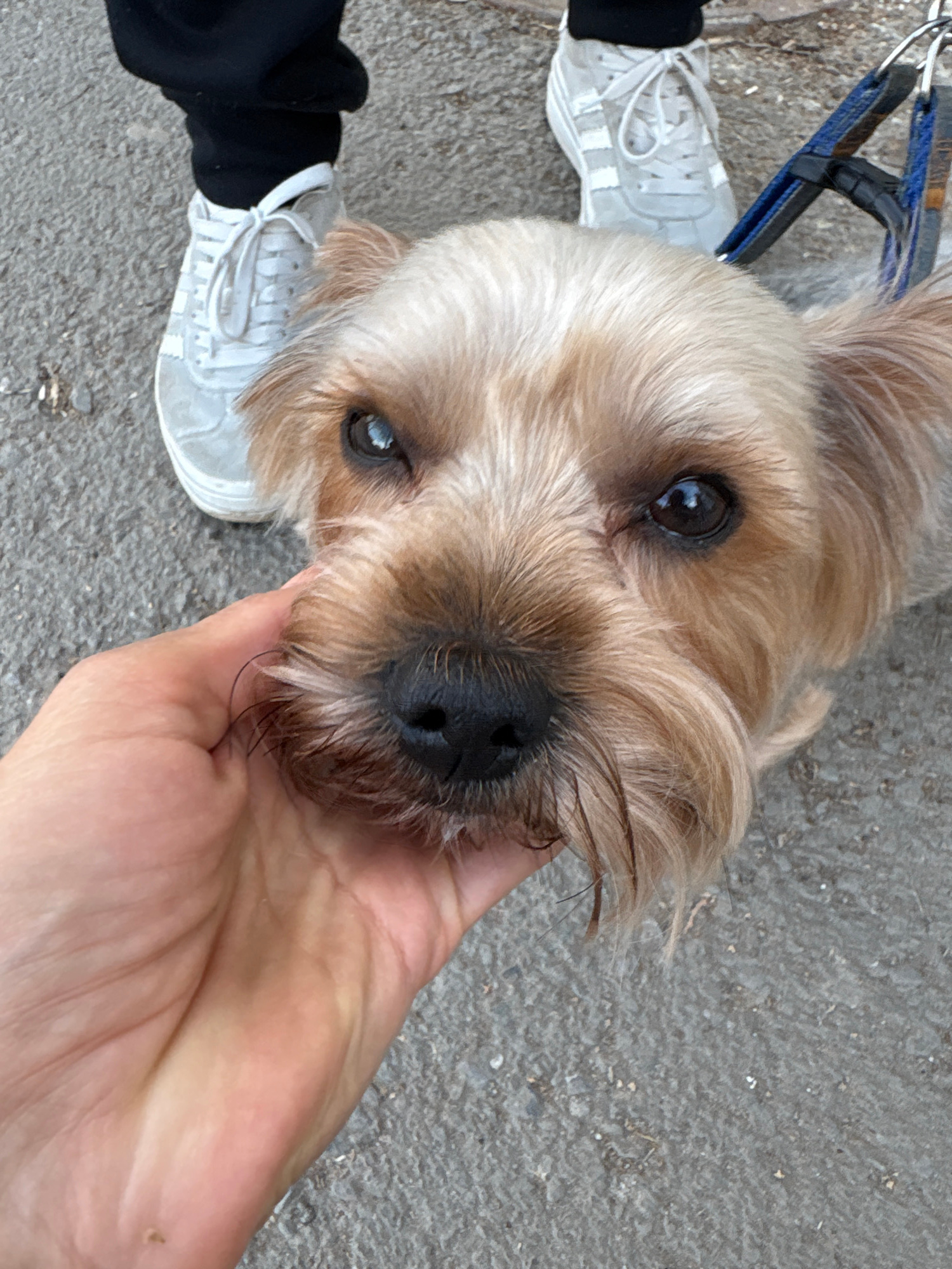 A close-up shot depicts a tan-colored dog with dark eyes being held by a person's hand. The dog is on a leash attached to a harness. The person is wearing white sneakers and black pants. The setting a…read more