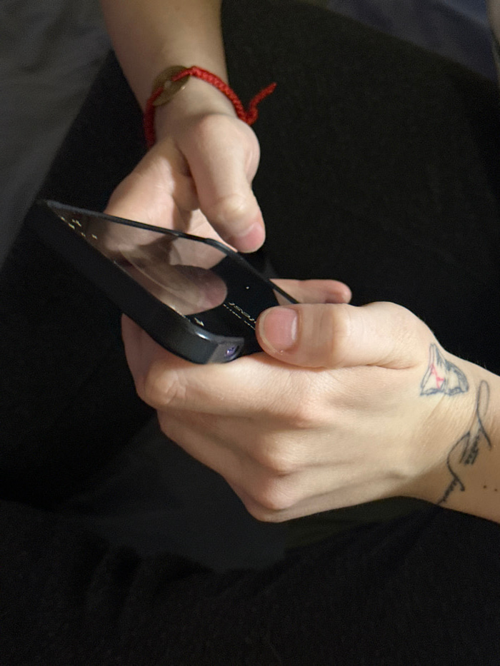 Two hands hold a black phone case. The right hand, adorned with wrist tattoos, secures the top corner of the case. The left hand, wearing a red braided bracelet with a coin, pushes the case from the b…read more
