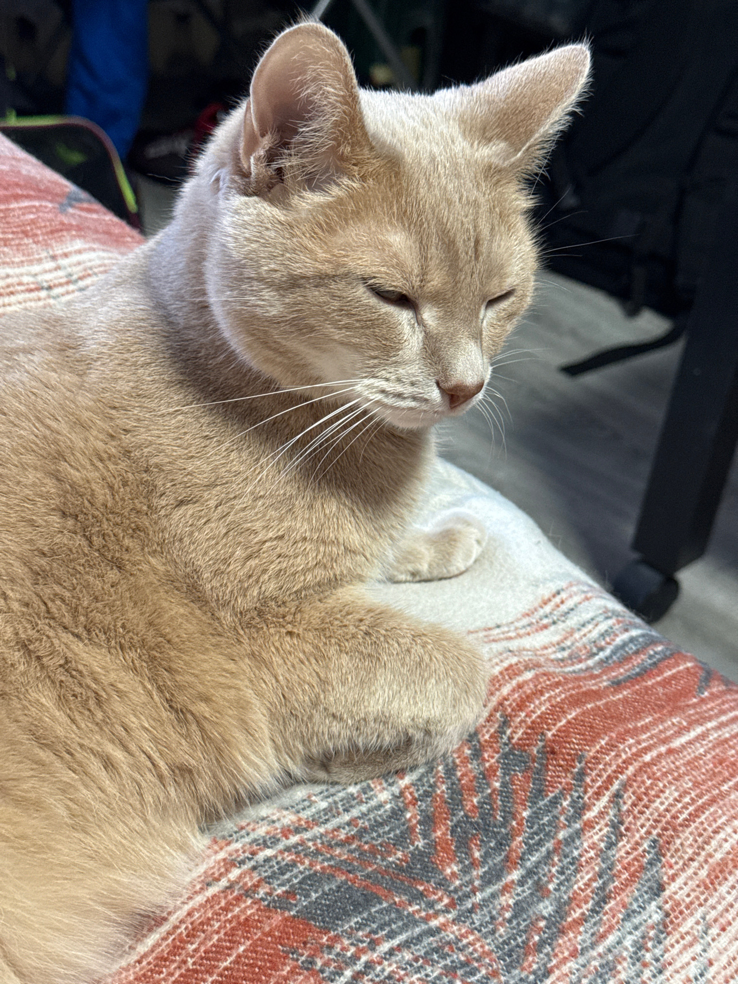 A domestic cat with beige fur is lying on a patterned blanket with red, gray, and white stripes. The cat is resting with its eyes closed, and its front paws are curled up near its chest. The backgroun…read more