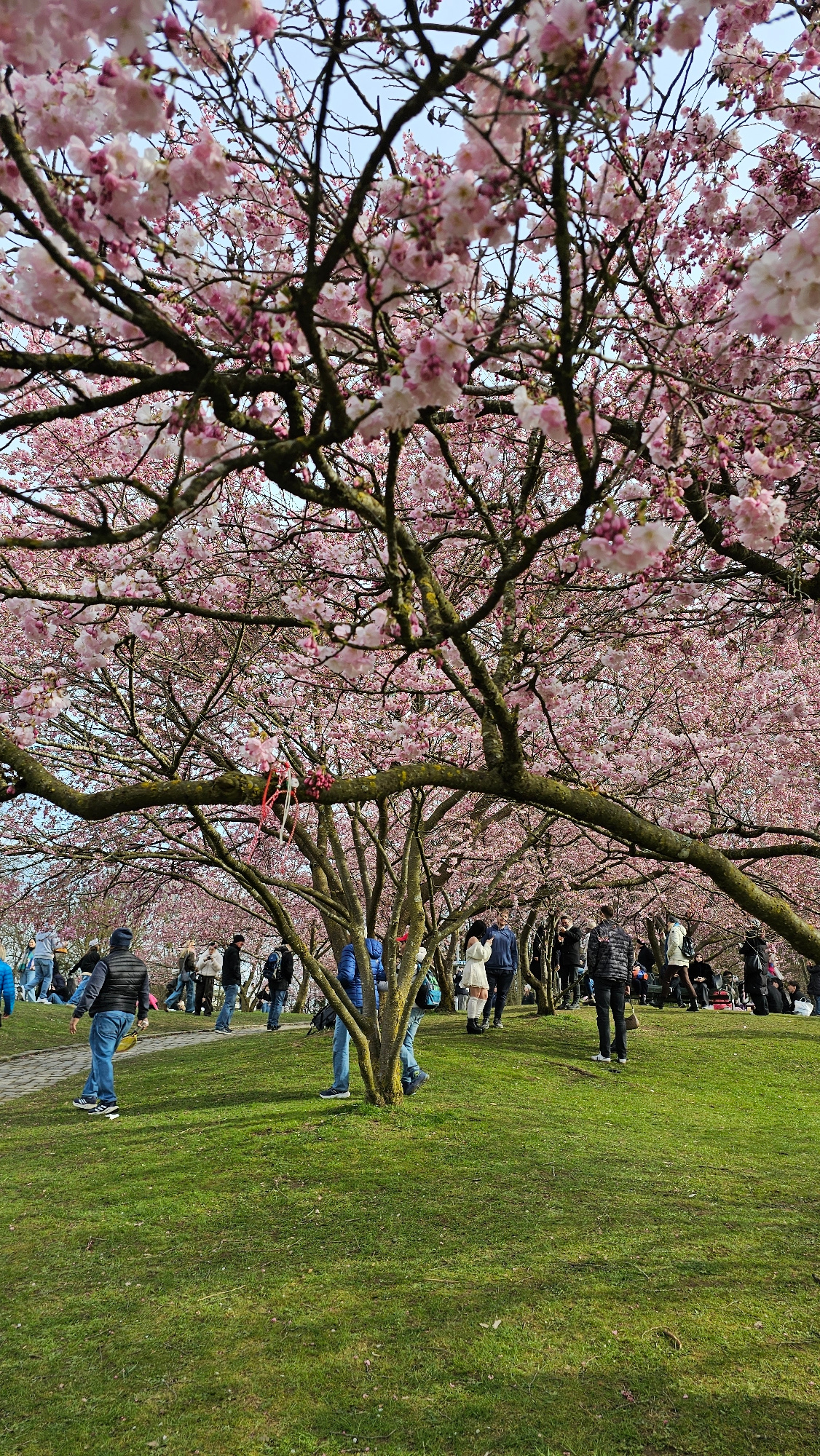 This image depicts a vibrant outdoor scene under a dense canopy of flowering cherry blossom trees, located within Olympiapark in Munich, Germany. The sky overhead is a clear light blue. The ground con…read more
