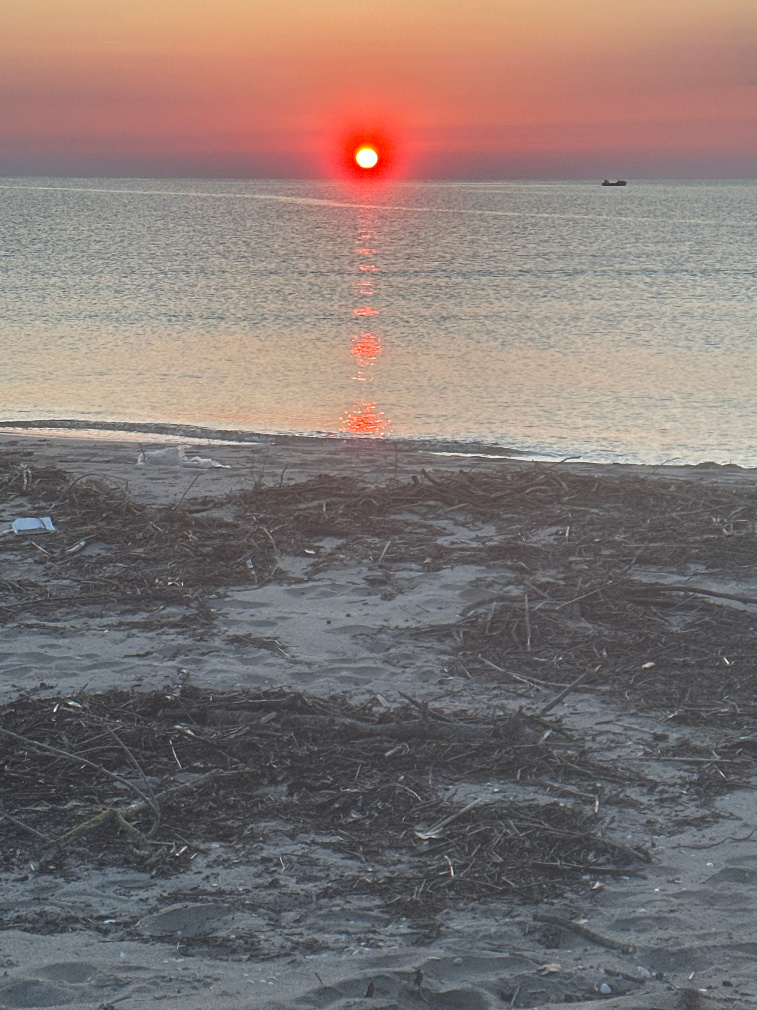 The image captures a sunset view at a beach in Kiten, Bulgaria. The sun is positioned low on the horizon, casting a red glow across the sky and reflecting on the water. The beach appears to have some…read more