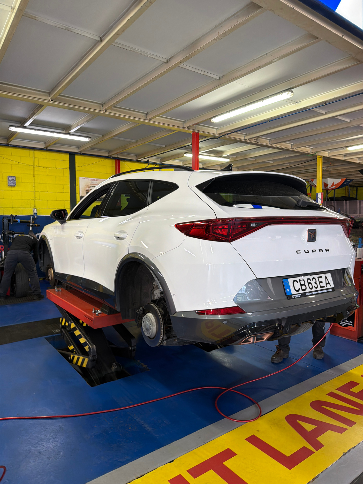The image shows a white Cupra SUV suspended on a red and black hydraulic lift inside what appears to be an automotive repair shop. The rear of the car is visible, with a license plate reading "CB63EA"…read more