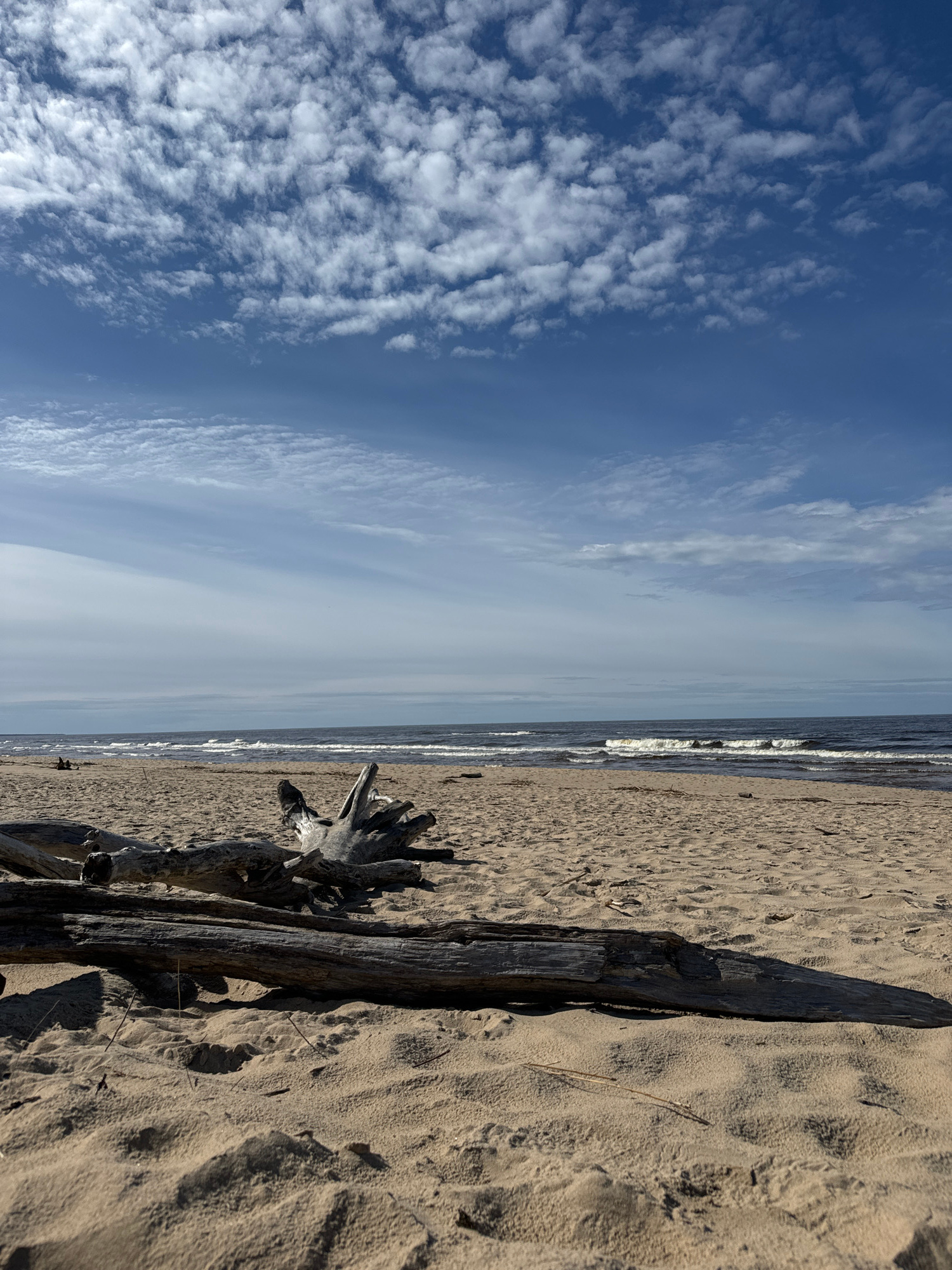 The image depicts a beach scene in Carnikava, Latvia. The view is oriented vertically, with the sky on the left and the beach on the right. The sky is blue with scattered clouds. A sandy beach stretch…read more