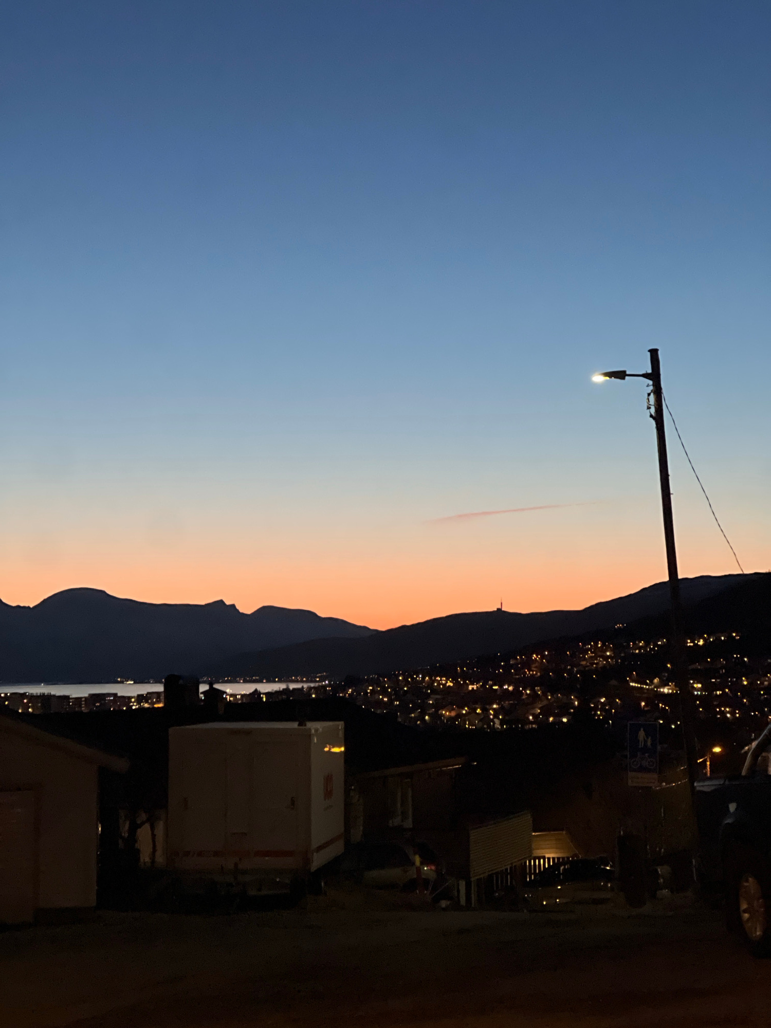 The image, oriented horizontally, captures a twilight or dawn scene over a coastal landscape, likely Tromsø, Norway. The sky dominates the left side, exhibiting a gradient from a deep blue at the top…read more