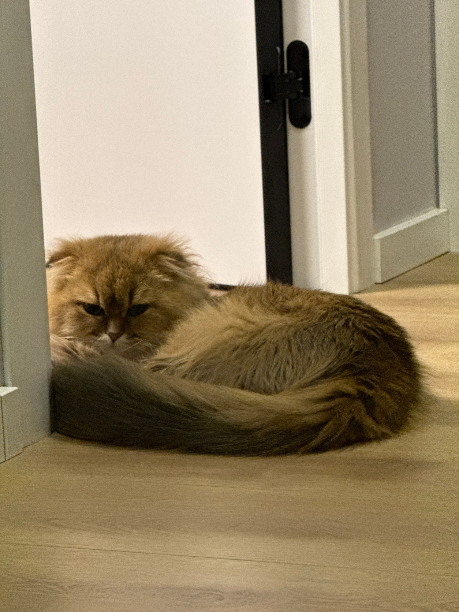 A cat is curled up on a windowsill next to a wooden wall. The cat is brown and grey, with a fluffy tail wrapped around its body. The windowsill is white, and there is a black latch visible on the wind…read more
