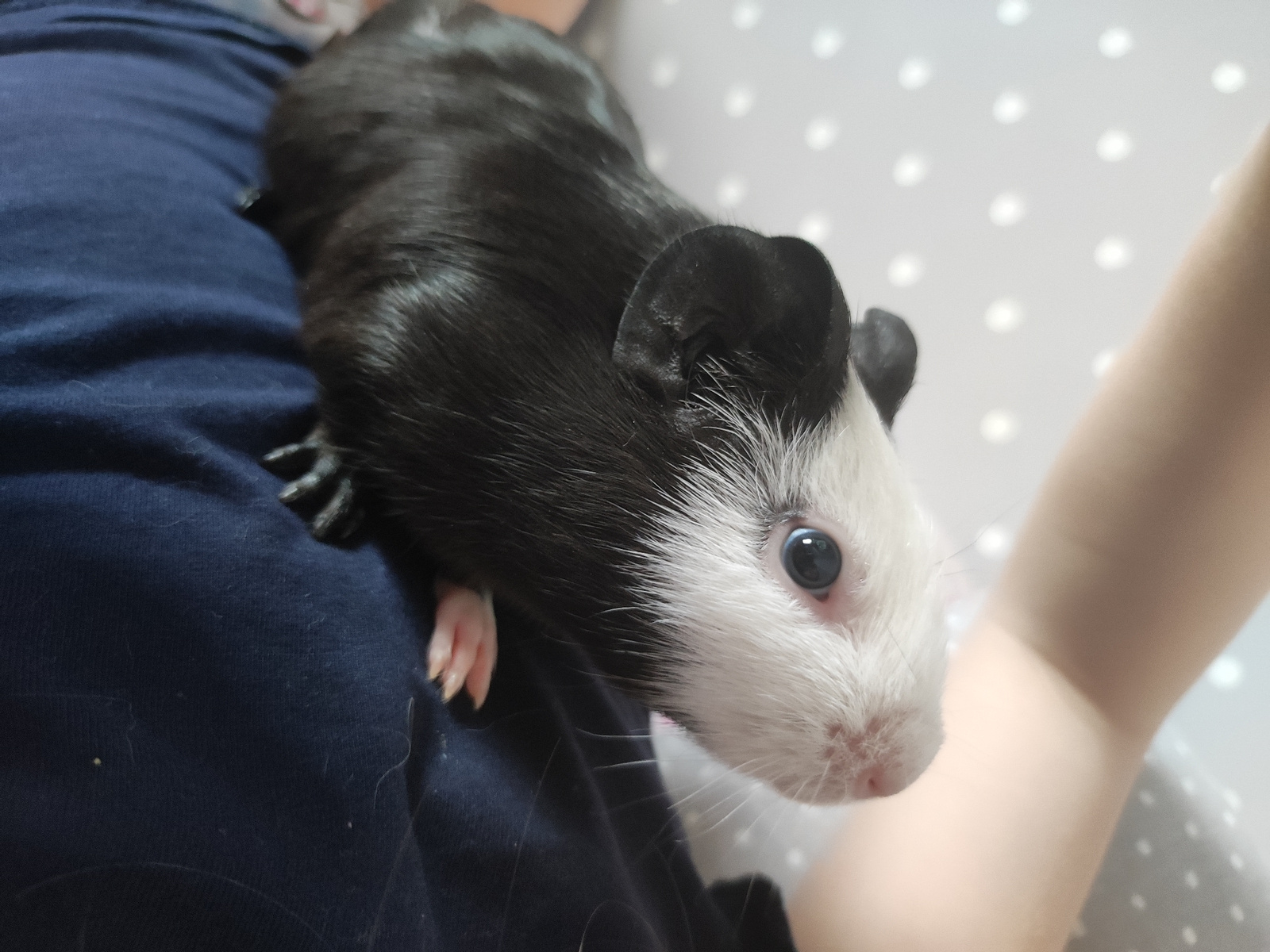 A close-up shot shows a black and white guinea pig resting on a person's blue-colored clothing. The guinea pig has a white face, dark eyes, and black ears and body. Its pink toes are visible on the le…read more