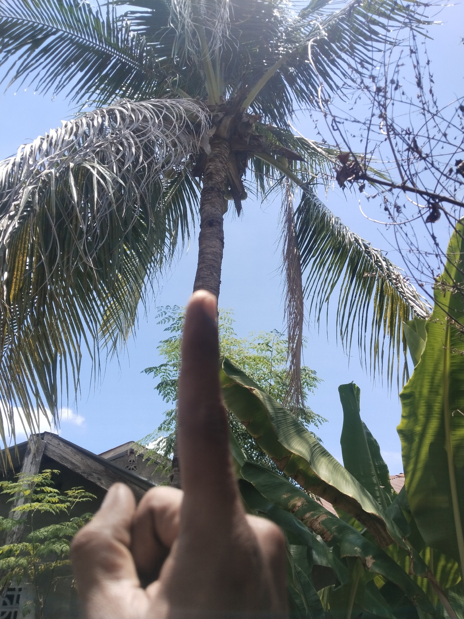 A ground-level photograph shows a person's finger pointing toward a coconut palm tree under a blue sky. The scene is located in Lhokseumawe, Indonesia, and includes a mix of tropical vegetation, such…read more