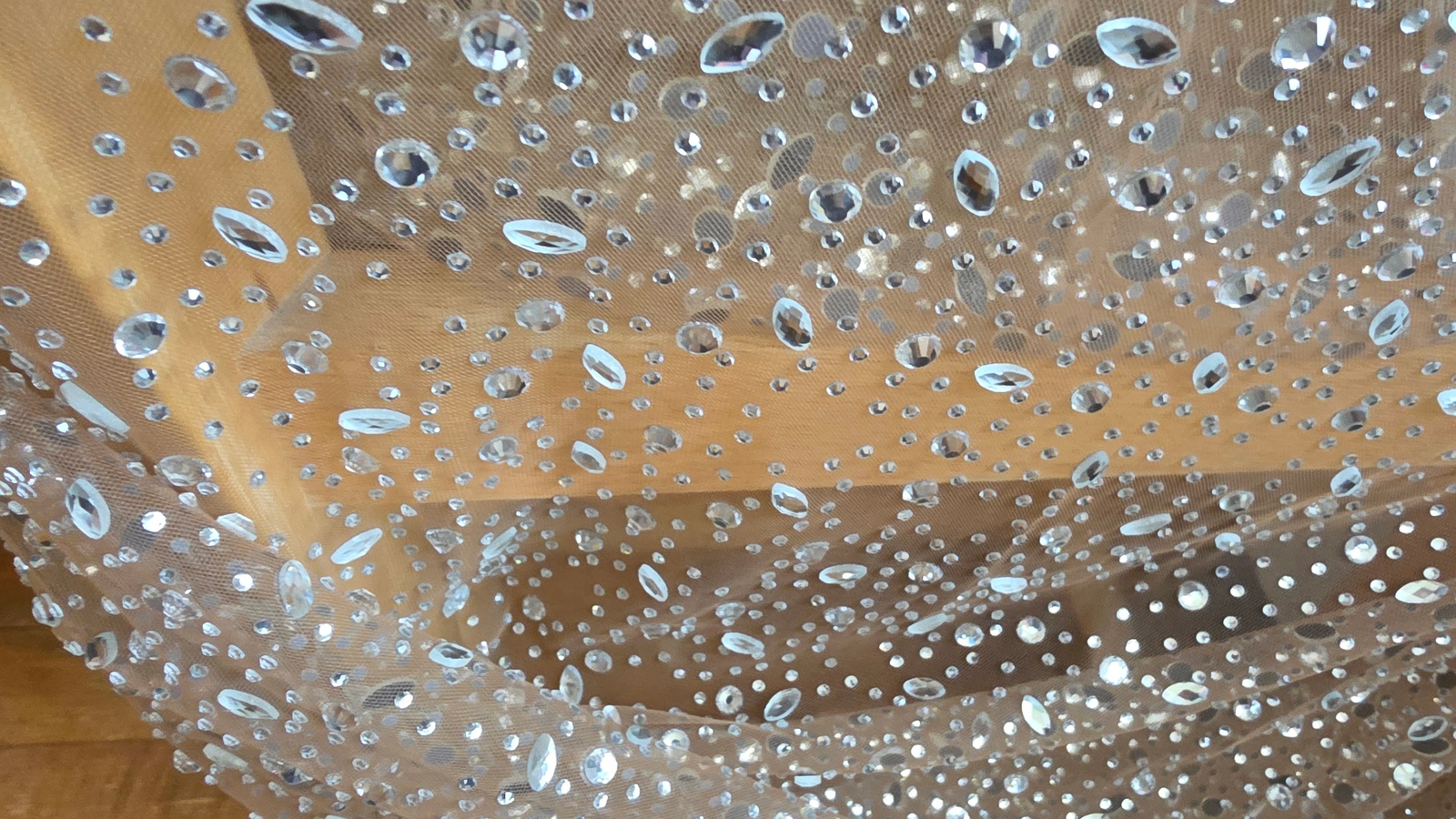 A close-up image showcases a piece of translucent, light brown or beige fabric densely embellished with sparkling clear rhinestones. The sheer material, possibly a mesh or tulle, is draped, creating g…read more