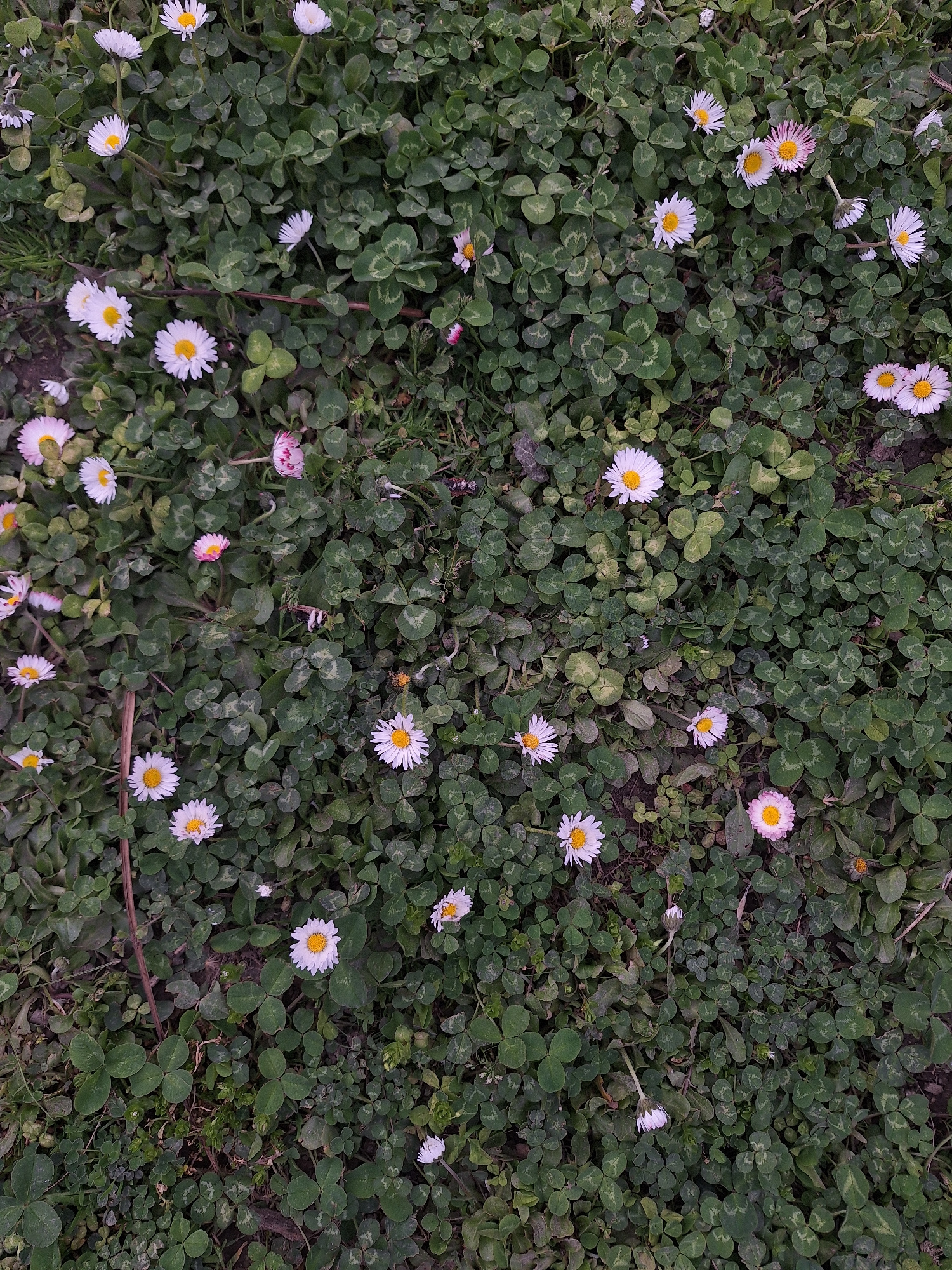 This image offers a vibrant, top-down view of a dense patch of ground covered primarily by small flowering plants and green foliage. The main subjects are numerous white and pink daisies interspersed…read more