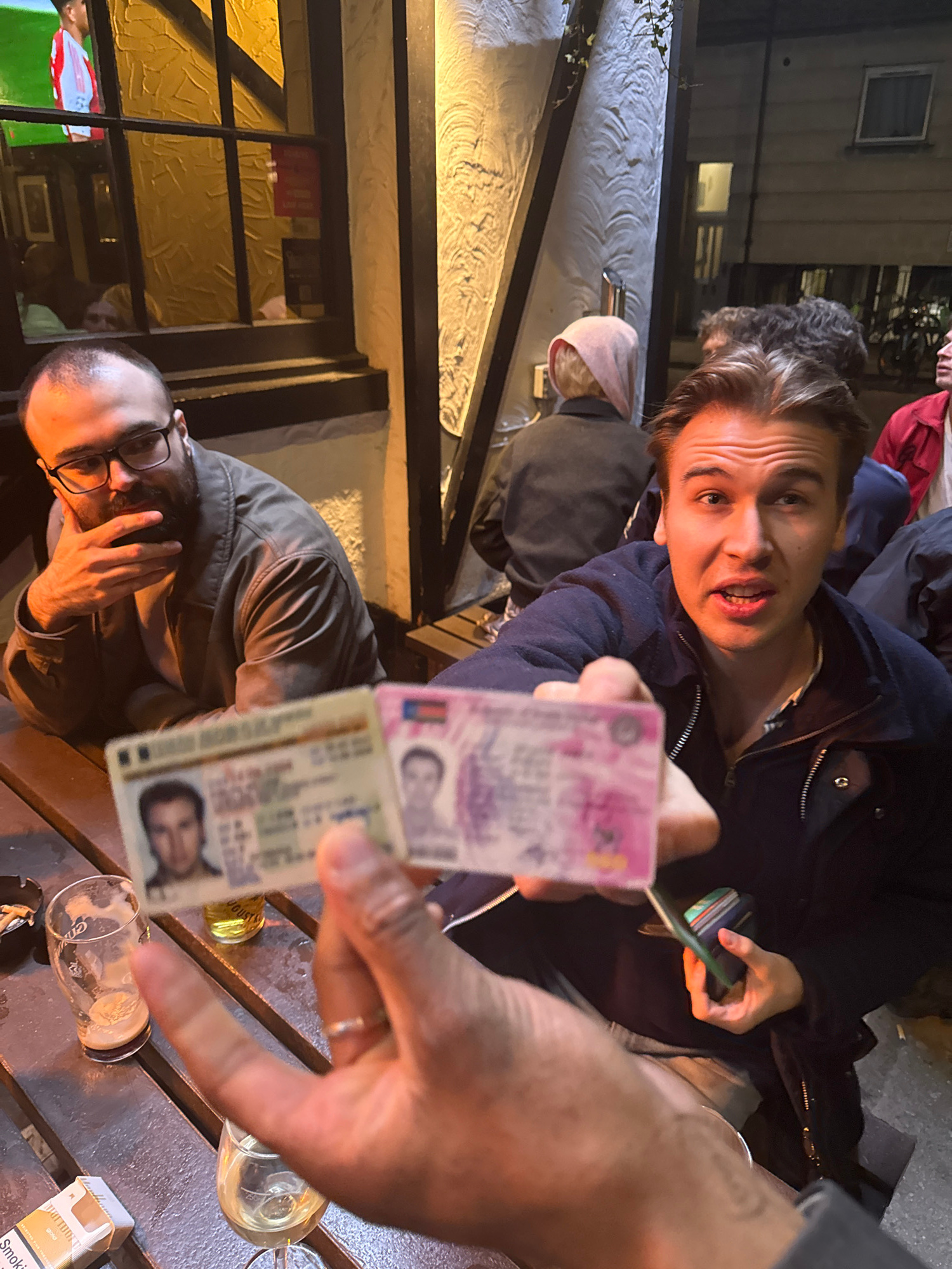The scene appears to be set outdoors, likely a pub garden or patio in London, UK. A young man is holding up two identification cards in front of the camera, with what appears to be a wallet in his oth…read more