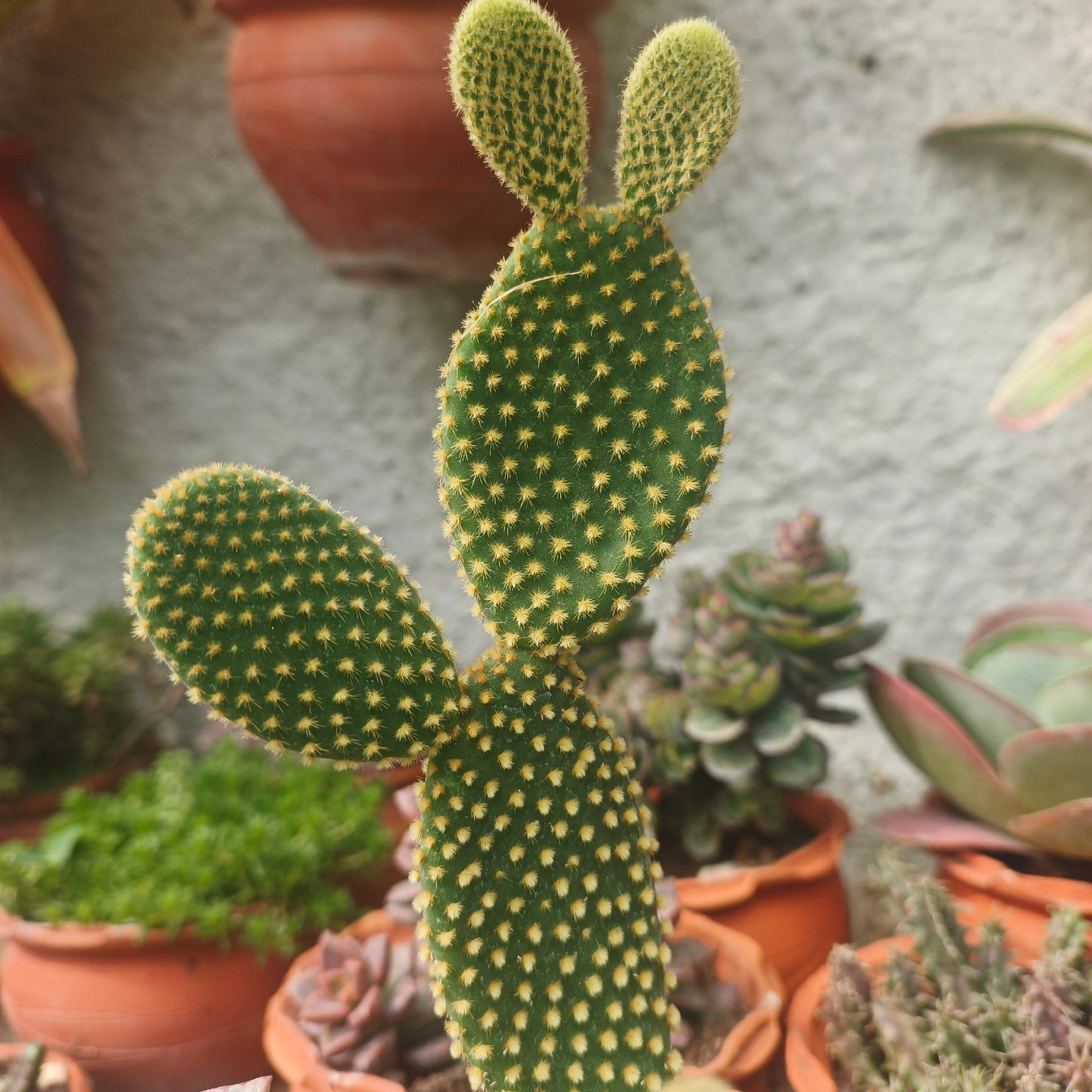The image shows a close-up of a bunny ear cactus (Opuntia microdasys) surrounded by other succulents in terracotta pots. The cactus is green with yellow glochids. The background features a textured gr…read more