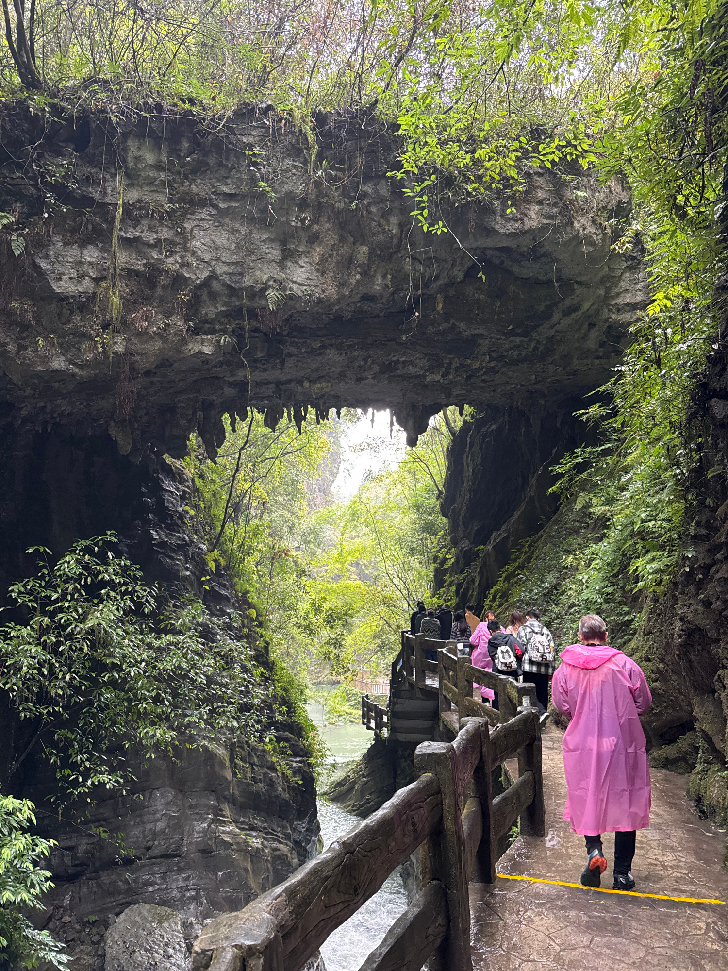 The image depicts a view through a narrow gorge, likely located in the Wulong District of China, known for its karst landscapes. The perspective is from inside a cave-like opening, looking outwards. T…read more