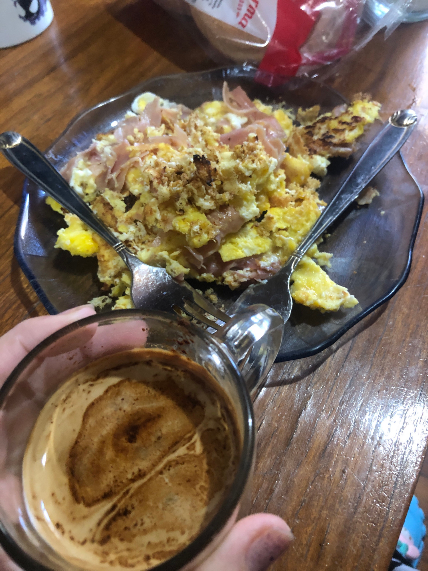 A plate of scrambled eggs with ham and breadcrumbs is placed on a wooden table in an indoor environment. Two silverware pieces are inside the plate of food. A clear glass of coffee with cream is held…read more