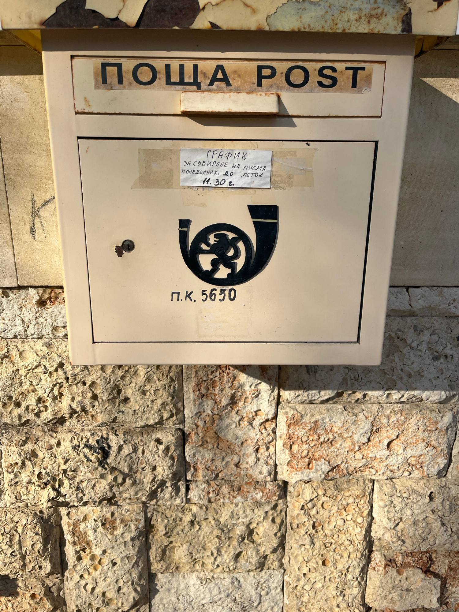 The image shows a light beige, weathered mailbox mounted on a stone wall. The mailbox has black lettering that reads "ПОЩА POST" vertically on the left side. A black logo and "П.К. 5650" are on the r…read more