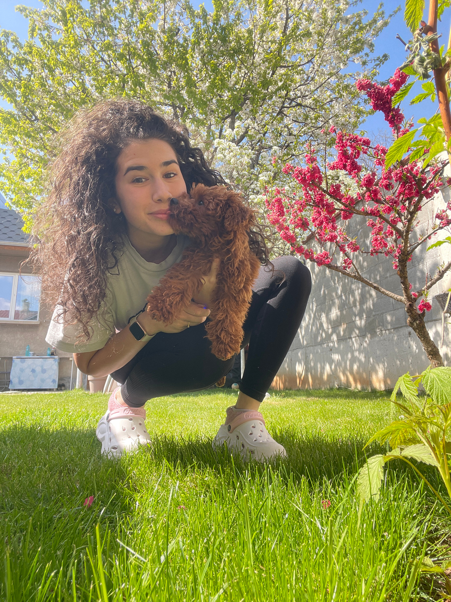 A young woman with long, dark, curly hair is depicted sitting outdoors, holding a small, fluffy brown dog. She has a gentle smile and looks directly at the viewer. She is wearing a light-colored t-shi…read more