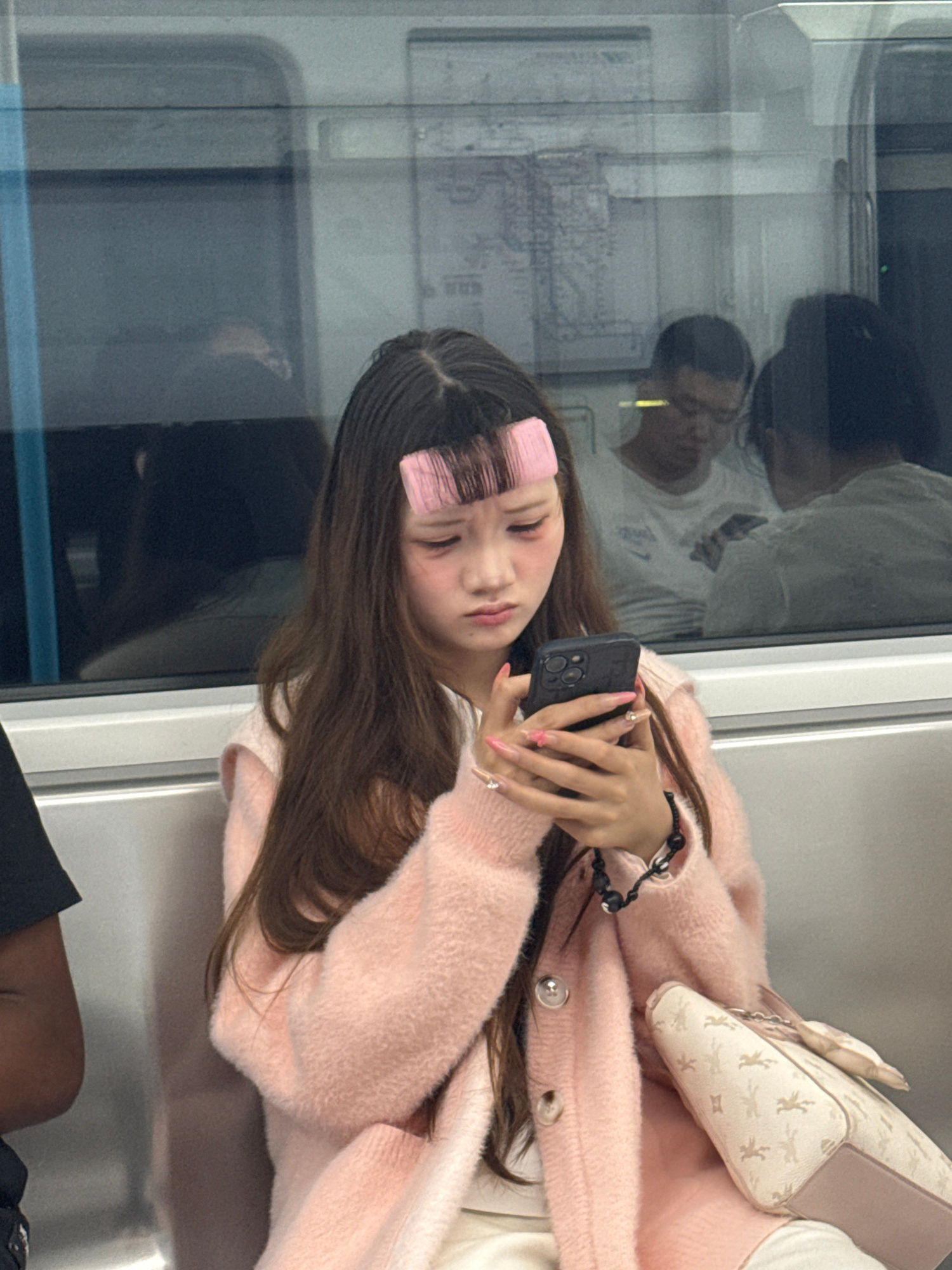 A young woman with long brown hair and pink hair clips is sitting on a subway train. She is wearing a pink sweater and a white handbag. She is holding a black smartphone and appears to be taking a sel…read more