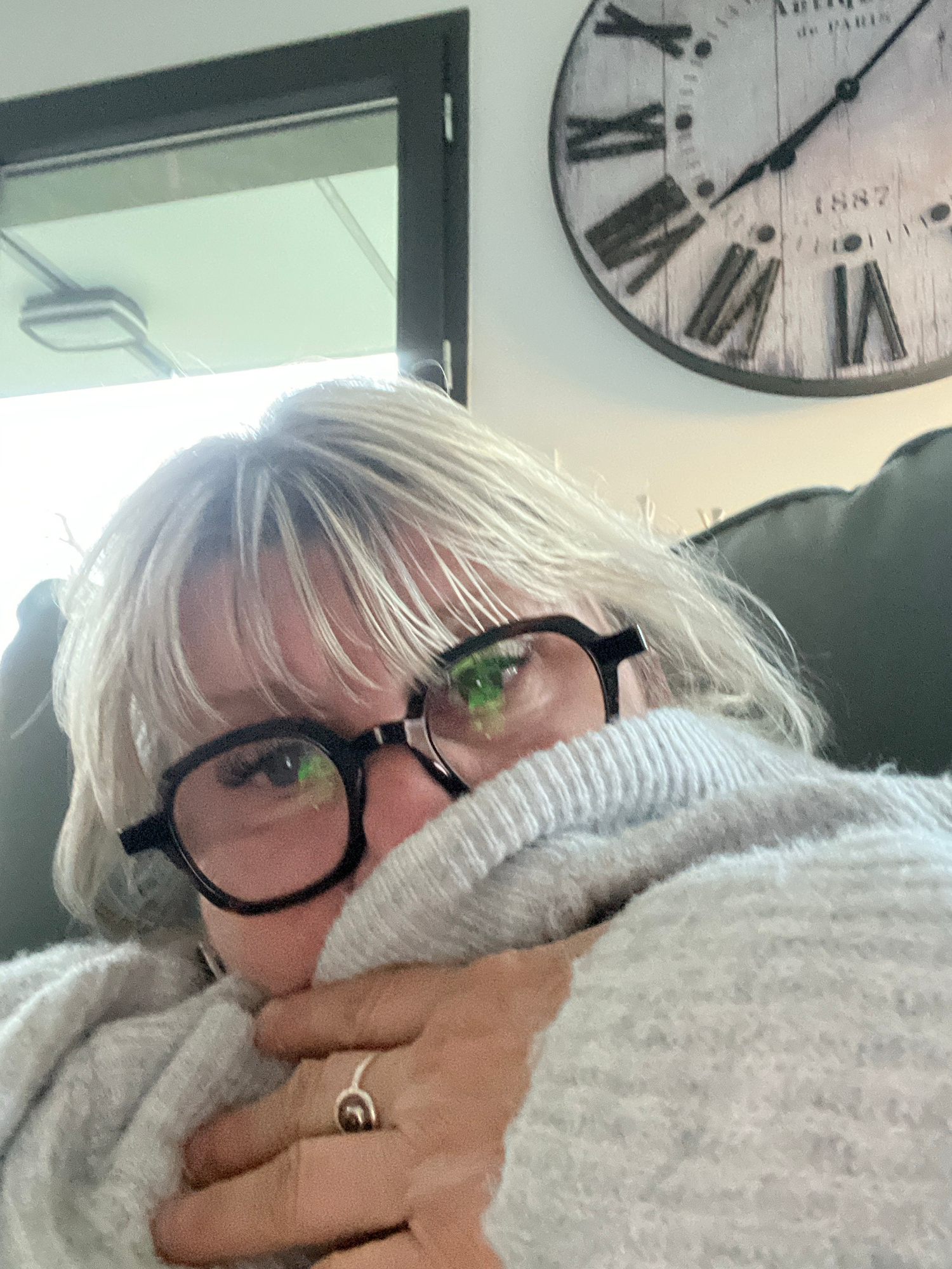 The image is a close-up, slightly angled view of a woman with short, blonde hair wearing black-framed glasses and a light grey sweater. Part of her face is visible, including her eyes behind the glass…read more