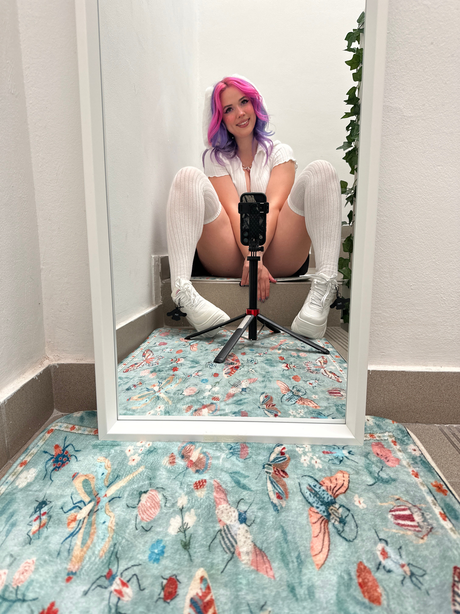 A person with pink and purple hair is posing for a selfie in a mirror. The person is wearing white shoes and socks and a white shirt. The floor in the mirror is covered in a blue rug with a colorful i…read more