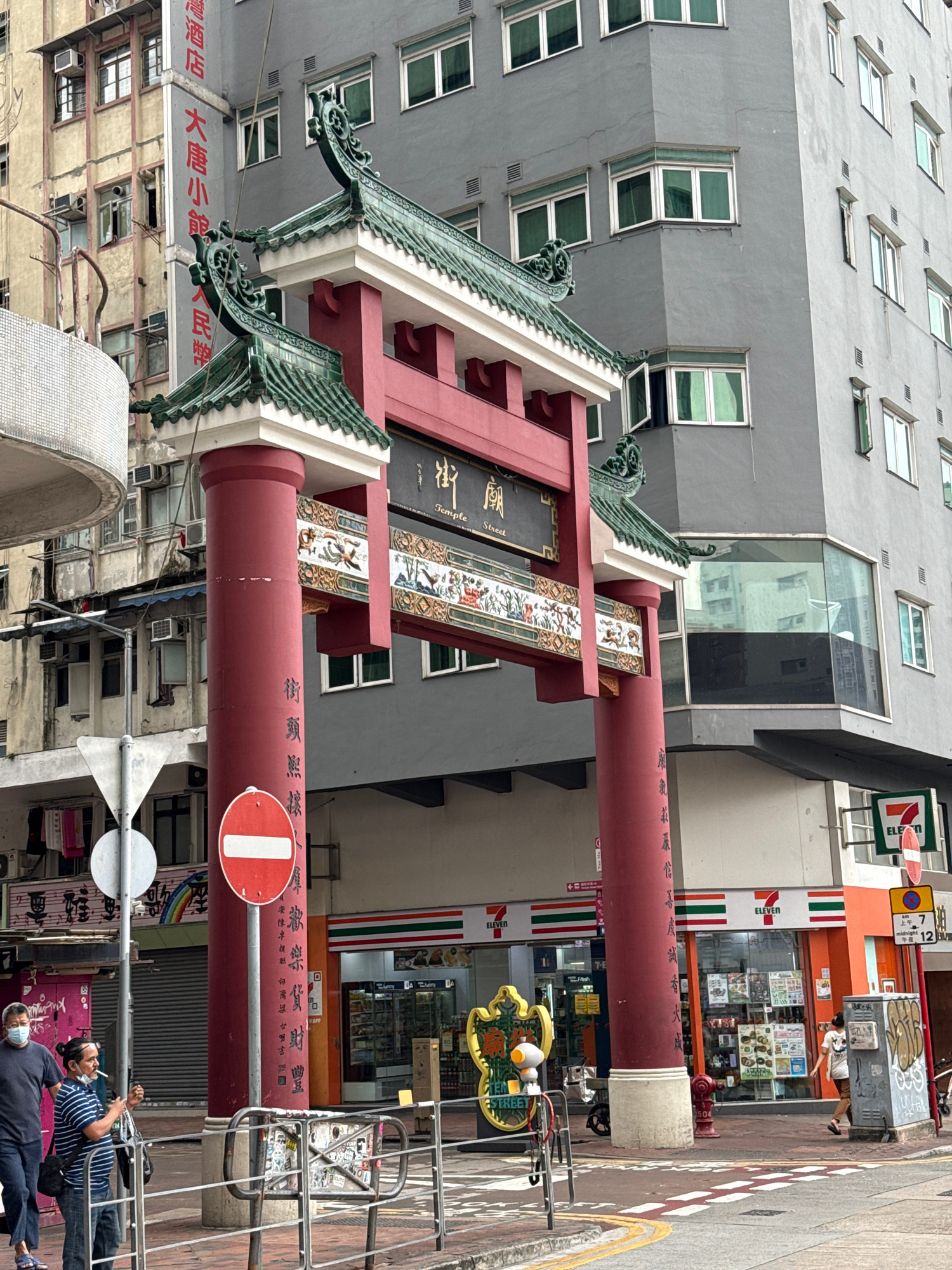 The image captures a street scene in Hong Kong, China. A traditional Chinese archway, with red pillars and green ornate detailing, dominates the view. The archway features Chinese inscriptions and decβ¦read more