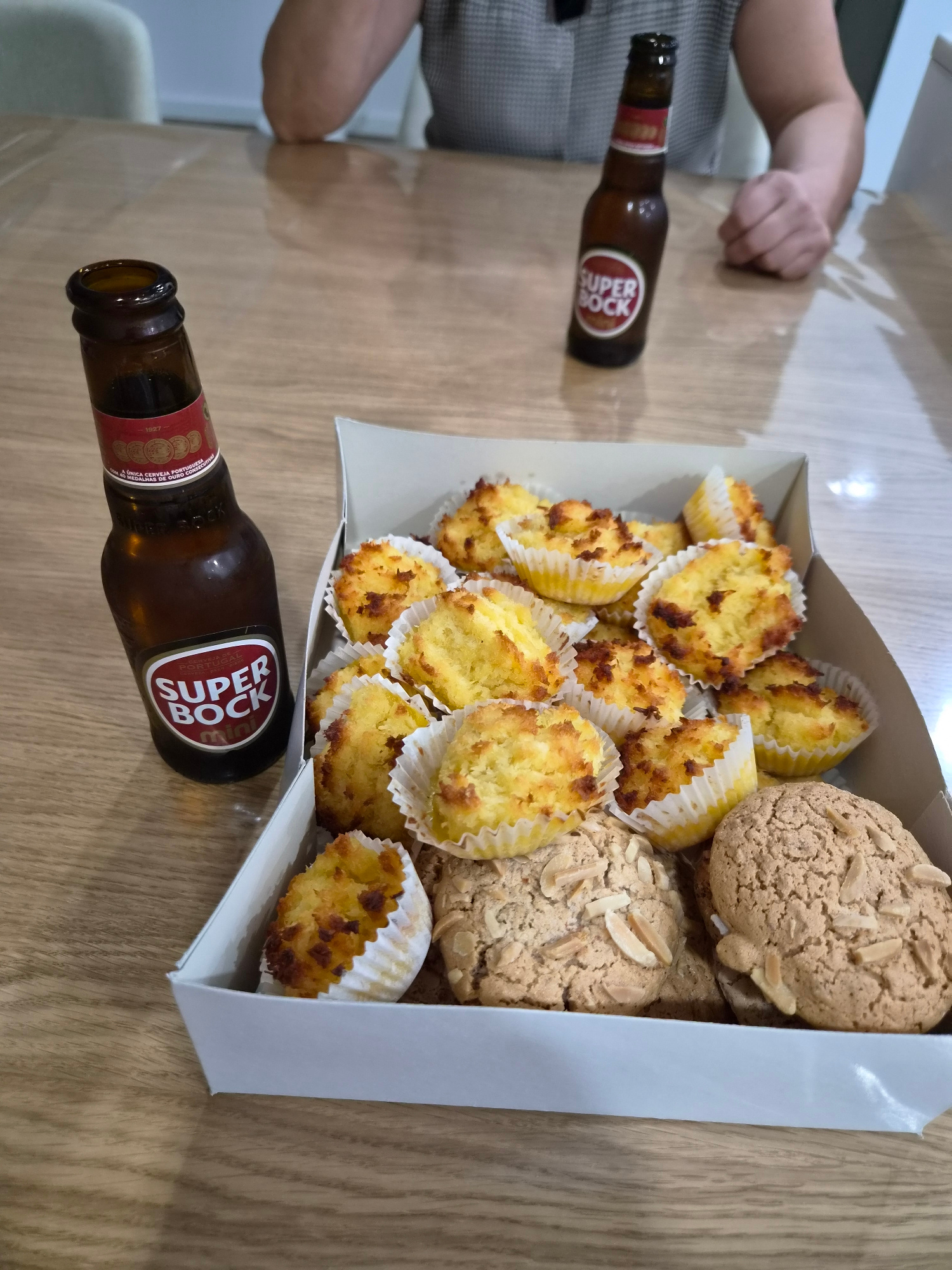 The image shows a box of pastries and two bottles of Super Bock beer on a wooden table. The pastries appear to be a mix of coconut cupcakes in white paper liners and almond cookies. One person's arm a…read more