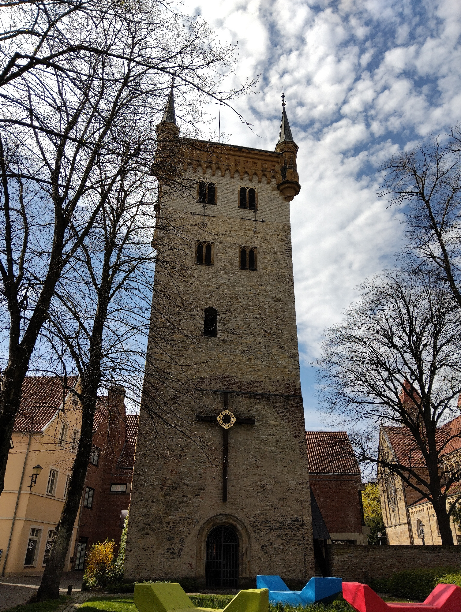 The image depicts the medieval Laurentiusturm tower in Warendorf, Germany. The stone tower, featuring small windows and decorative elements near the top, stands tall against a backdrop of a partly clo…read more