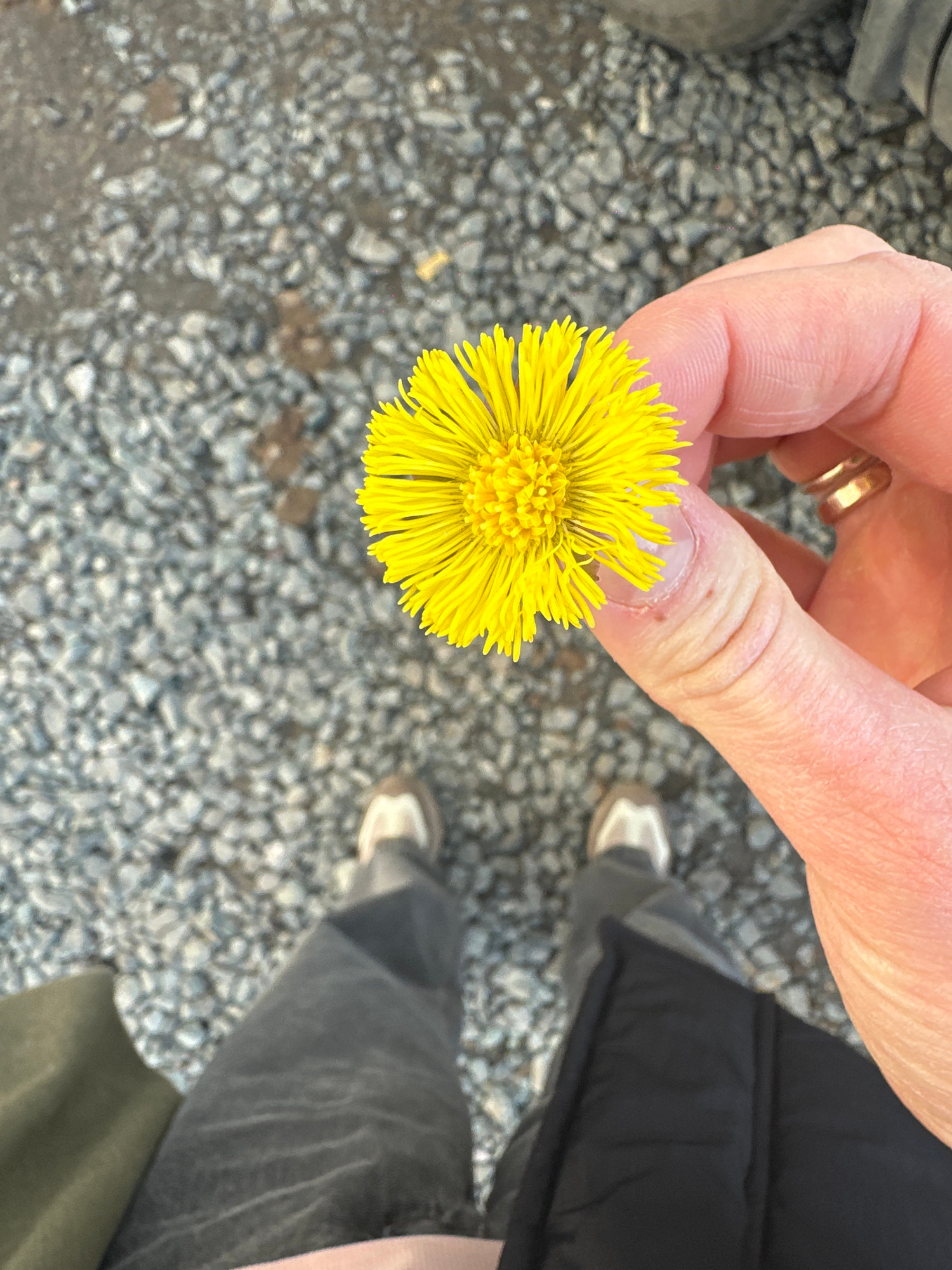A hand, adorned with a gold ring on a finger, holds a vibrant yellow flower. The background is comprised of small grey stones. A person is standing on the stones, wearing grey jeans and white sneakers…read more