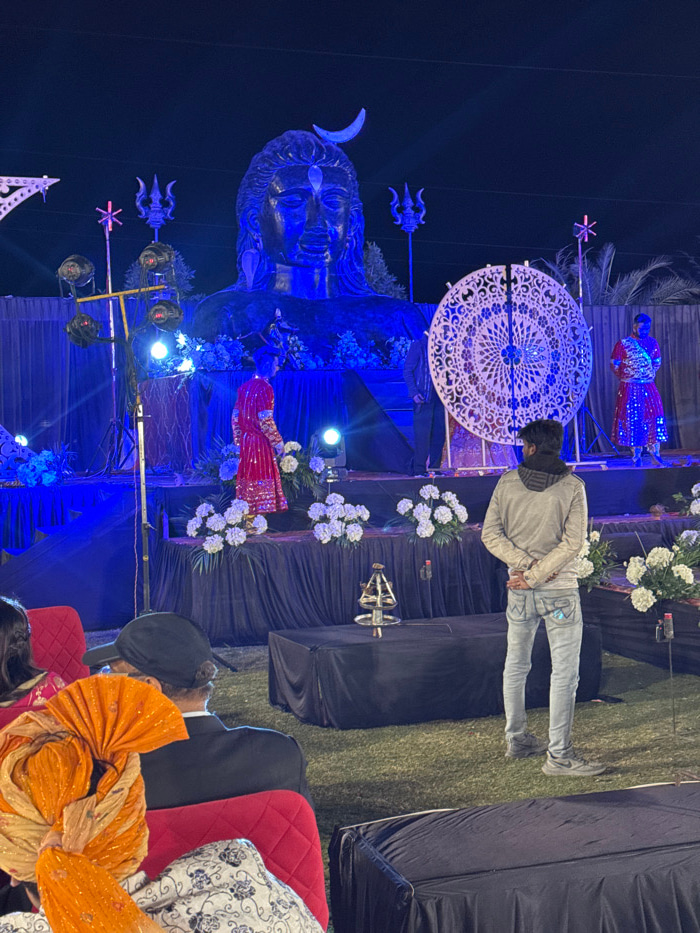 A scene is captured at night with a large, blue-lit statue of Shiva, adorned with a crescent moon. A person in a light jacket and jeans stands in front, looking at the statue. Floral arrangements and…read more