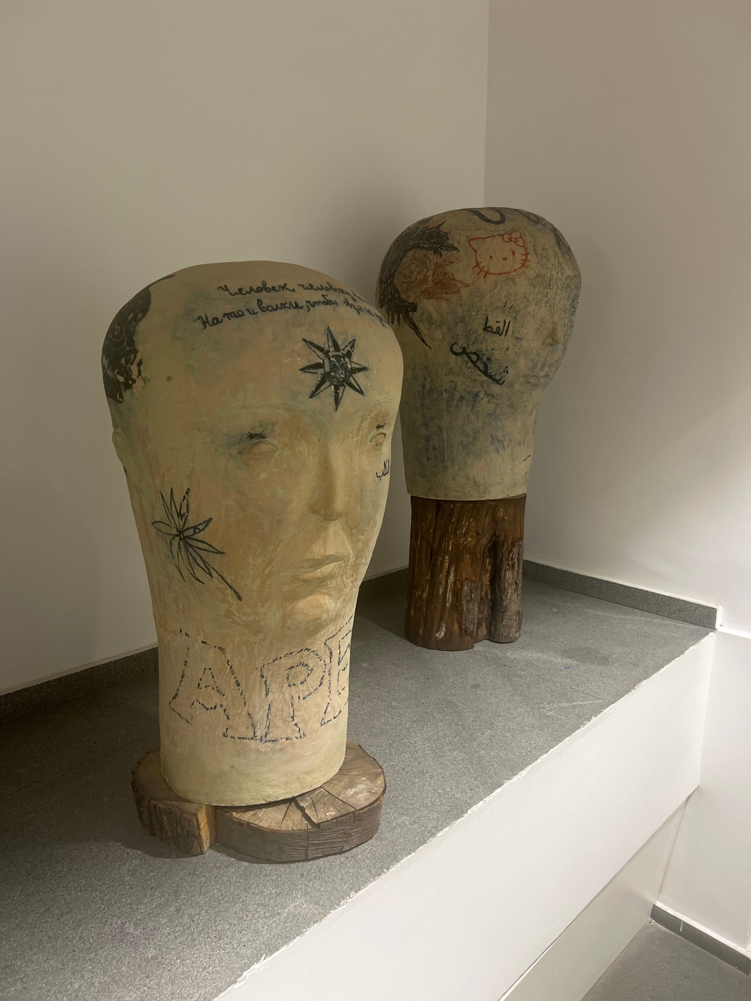 Two sculptural head busts are displayed side-by-side in what appears to be an indoor exhibition space with white walls and a grey floor. The busts are made of a light-colored material, possibly plaste…read more
