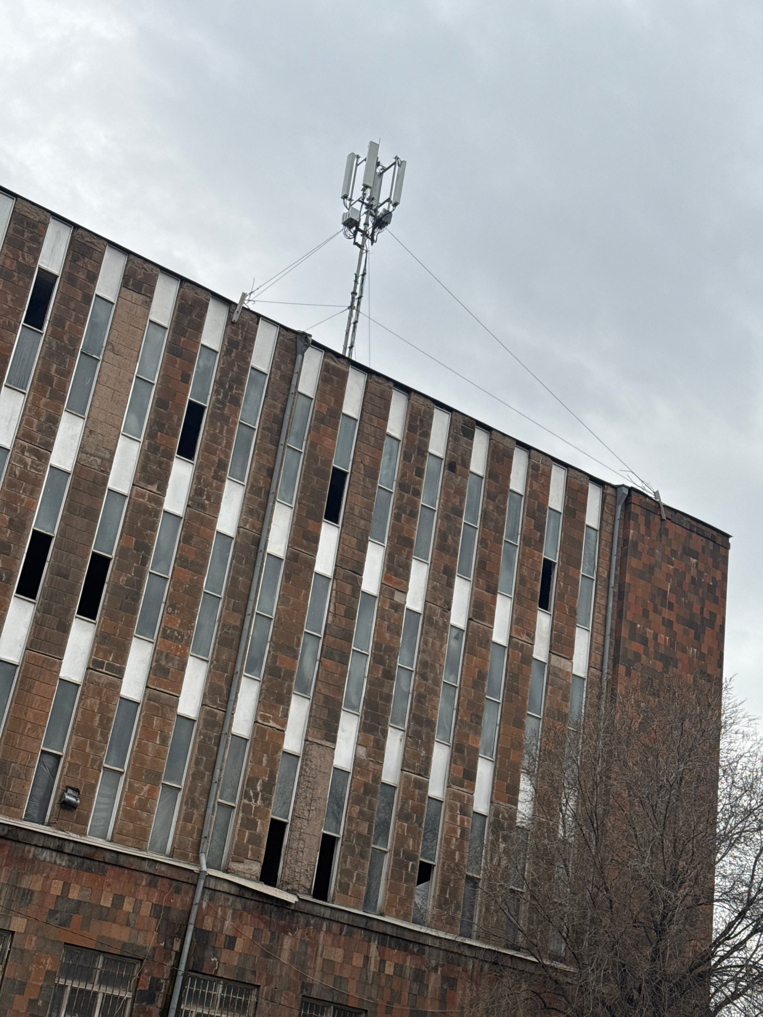 The image depicts the exterior of a multi-story building, possibly in Yerevan, Armenia, though this is unconfirmed. The building is constructed from brown brick and concrete with a repetitive patternβ¦read more