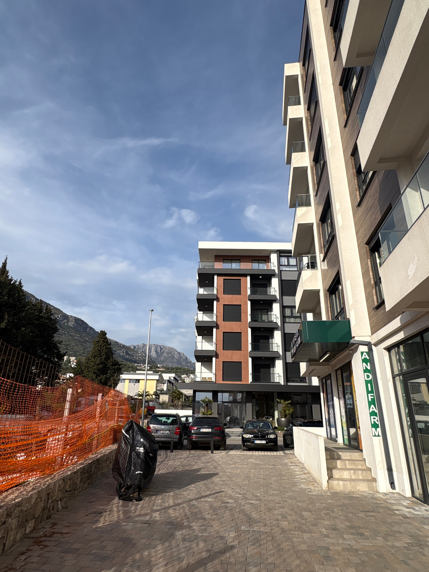 The image depicts a street scene in Bar, Montenegro. In the foreground, an orange construction barrier runs along a brick wall. A large black object, possibly a covered motorcycle, sits on the brick-p…read more