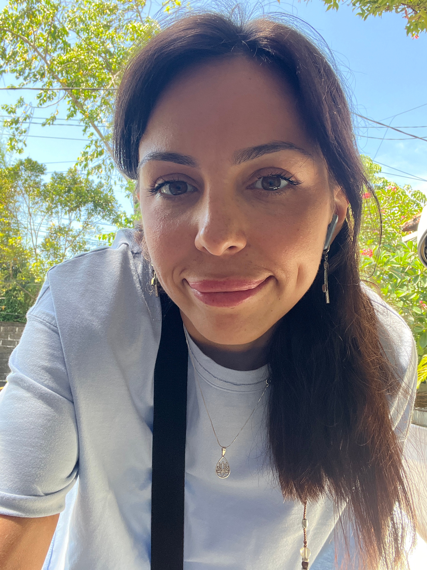 A woman poses outdoors in Kuta Selatan, Indonesia, on a sunny day. The woman is wearing a light blue long-sleeved shirt and a silver necklace with a pendant. She has dark brown hair and brown eyes. A…read more