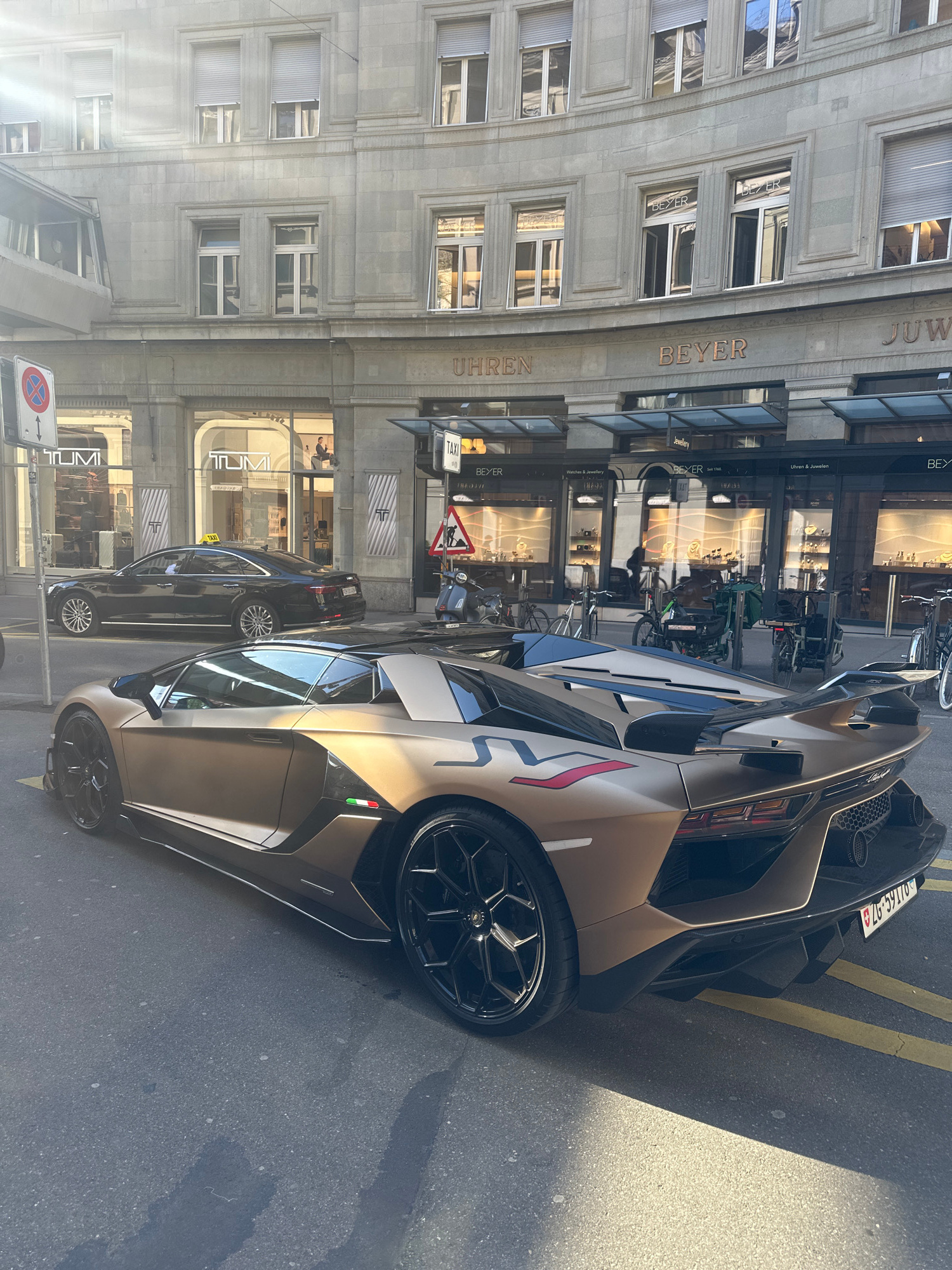 The image captures a scene in Zurich, Switzerland, featuring a gold-colored Lamborghini car parked on the street. The location appears to be near Bahnhofstrasse, as indicated by the "BEYER" signs andβ¦read more