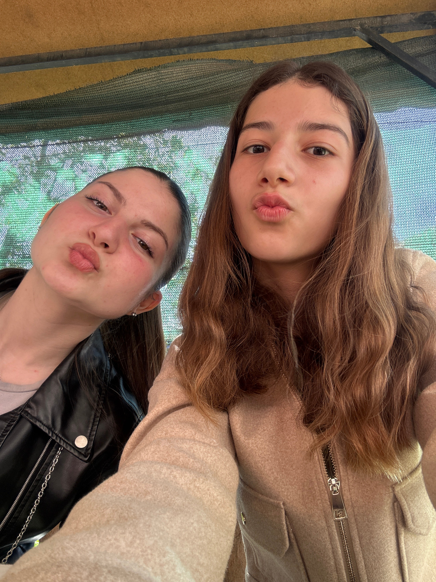 Two young women are captured in a selfie-style photograph, taken from a high angle and rotated 90 degrees counter-clockwise. Both subjects are looking towards the camera with playful "duck face" expre…read more