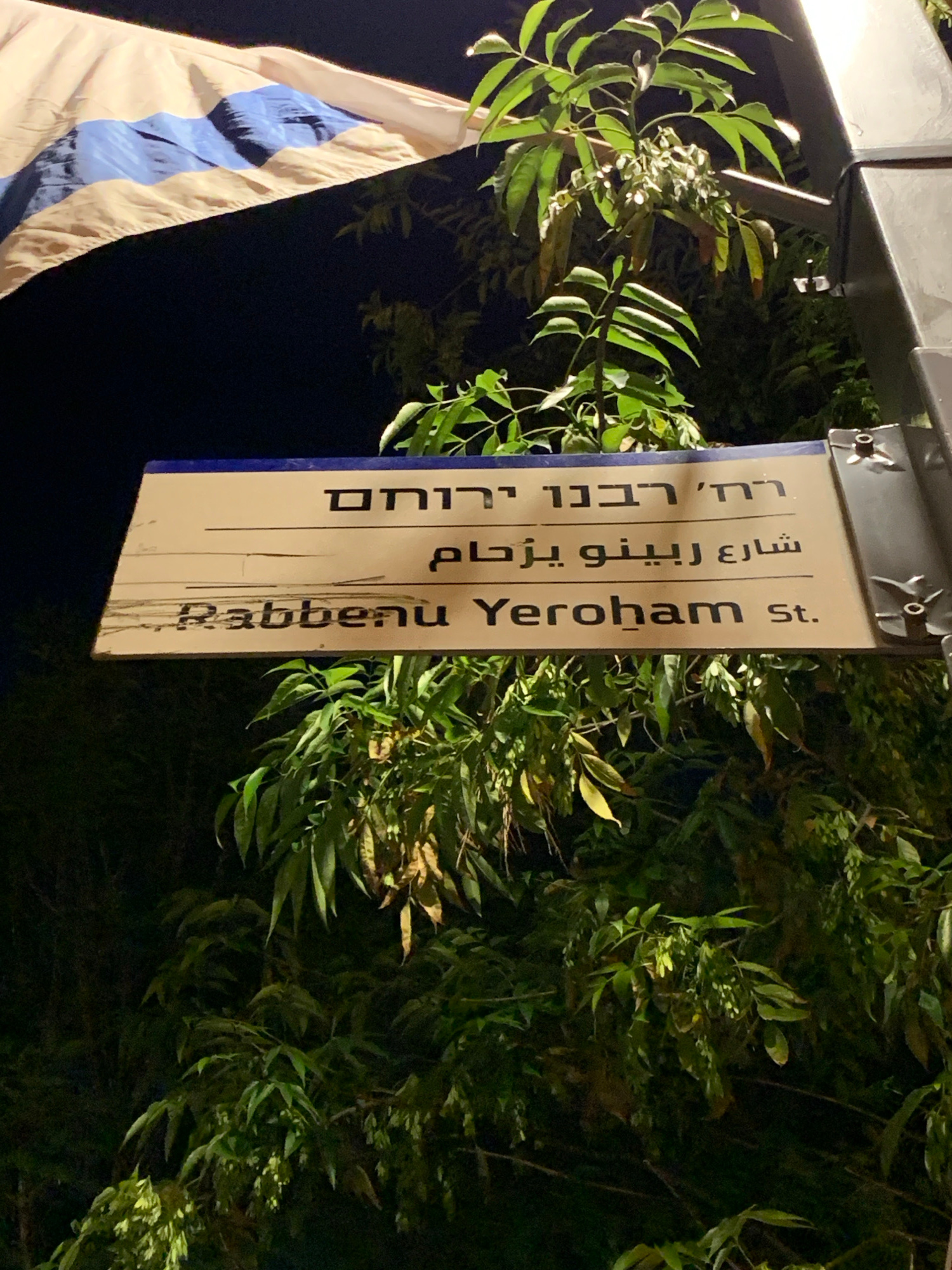 An angled, outdoor, close-up shot focuses on a street sign for "Rabbeinu Yeroham St." written in both English and Hebrew (and possibly Arabic). The sign is off-white with blue edges and black letterin…read more