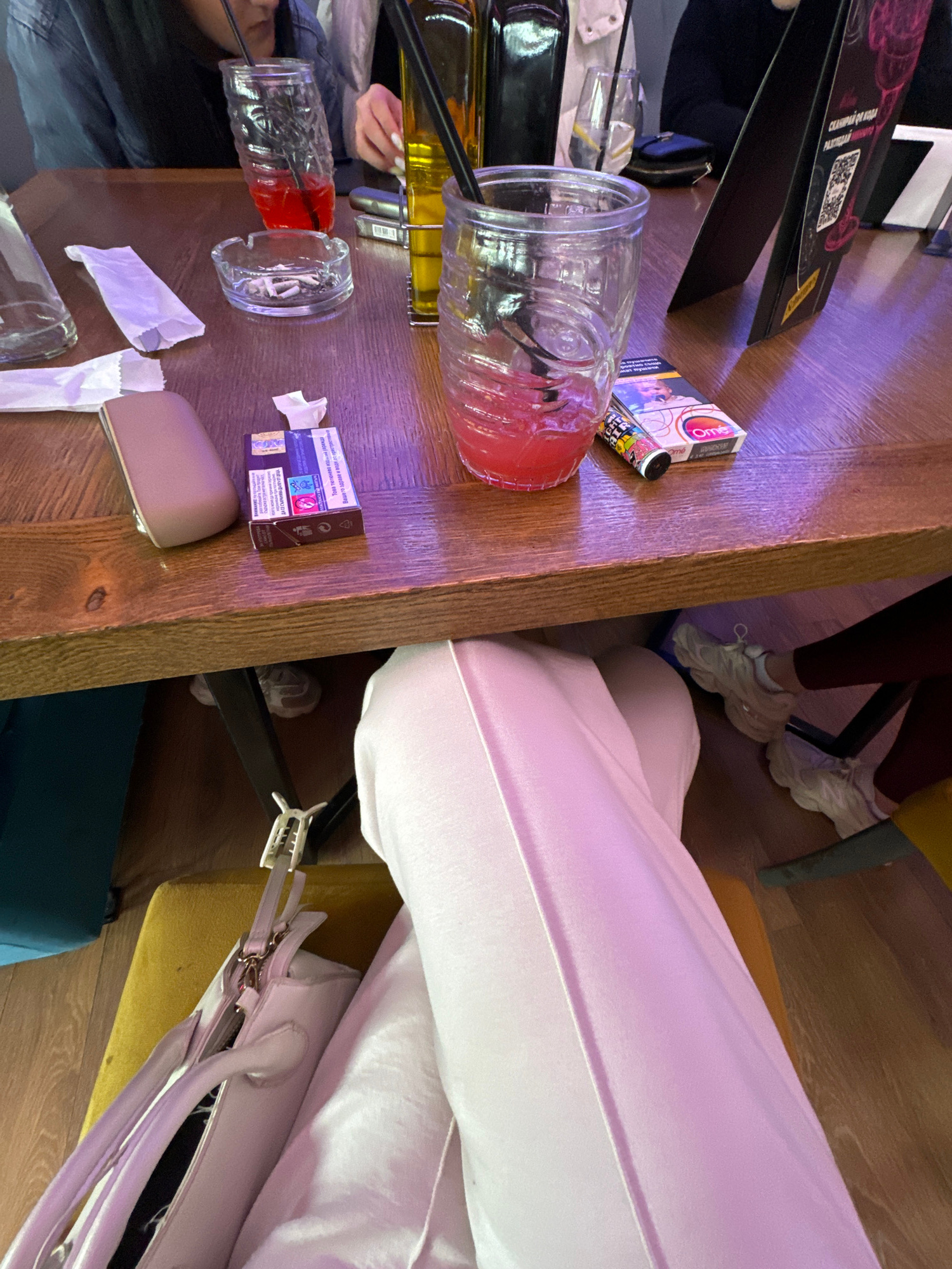 The image provides an overhead view of a wooden table in a dimly lit indoor setting, likely a cafe or bar, illuminated by strong purple ambient lighting. The scene suggests an evening social gathering…read more