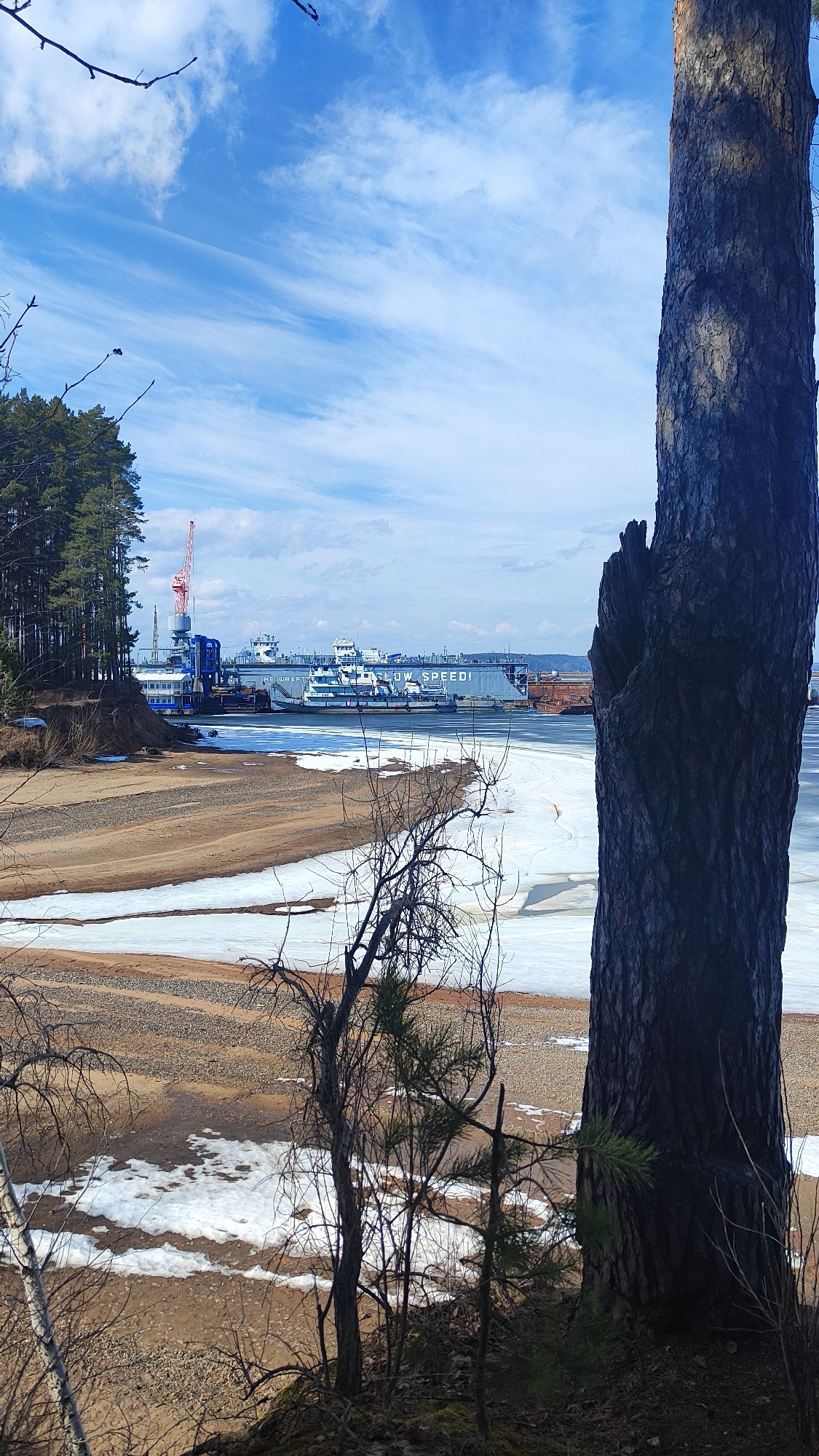 This media file captures a waterfront scene in Chaikovsky, Russia, depicting a transition from winter to spring. The foreground features a sandy and gravelly shore partially covered with melting snow…read more