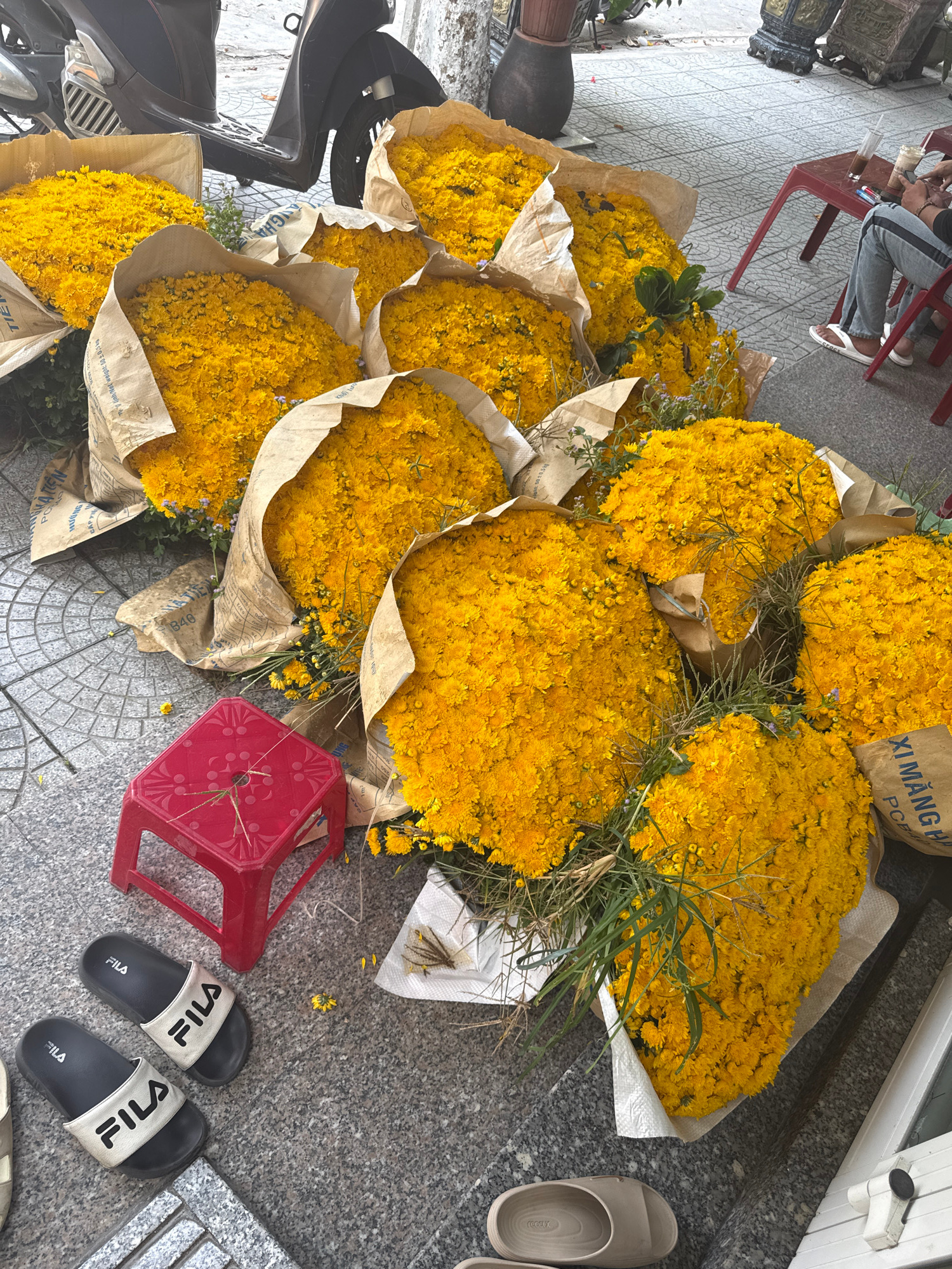 The image shows a collection of yellow chrysanthemums, likely for sale, in Đà Nẵng, Vietnam. Multiple bouquets are wrapped in brown and white paper, and some are simply bundled together. To the right,…read more