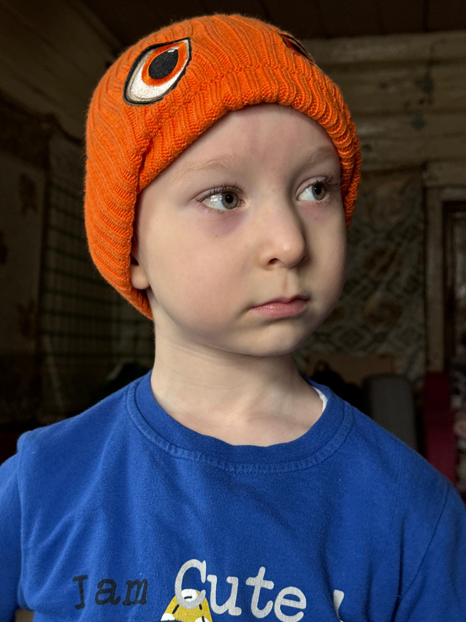 A close-up, slightly rotated studio shot of a child wearing an orange knit cap with a design resembling an eye. The child has fair skin and light-colored eyes, and is wearing a blue shirt with the par…read more