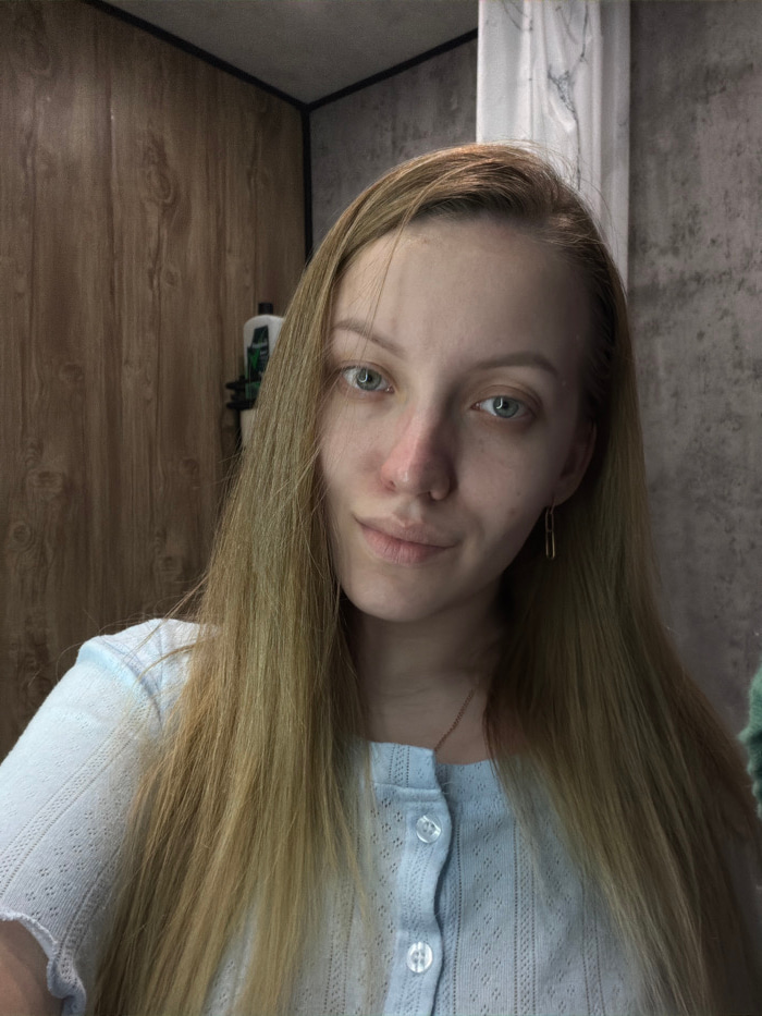 A female subject is depicted from the chest up, positioned centrally and looking directly at the camera. She has long, straight, light blonde hair parted slightly off-center, reaching below her should…read more