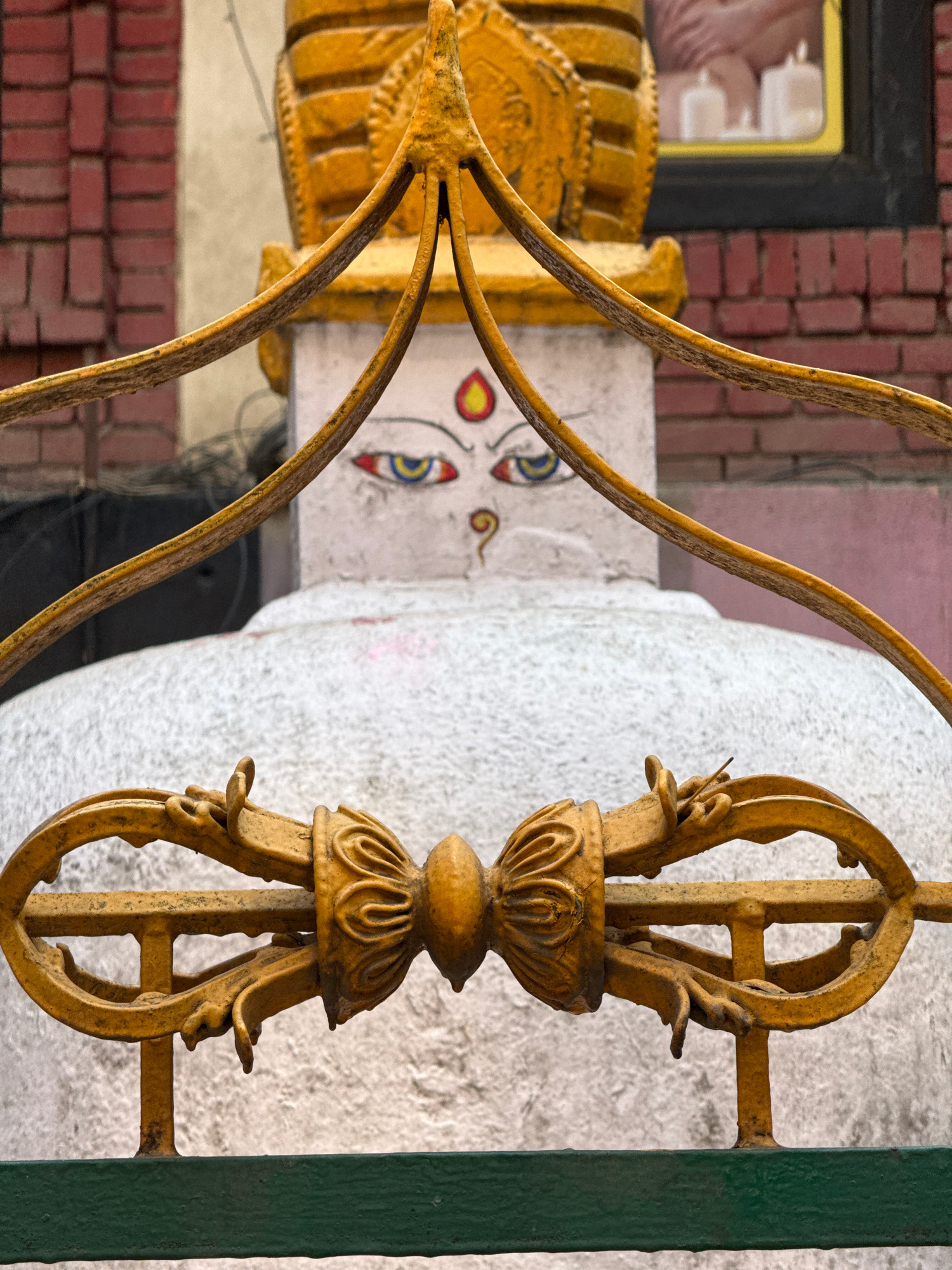 The image shows a close-up of ornate, golden-colored wrought ironwork. The ironwork has decorative finials and is mounted on a green bar, suggesting a gate or railing. In the blurred background, there…read more