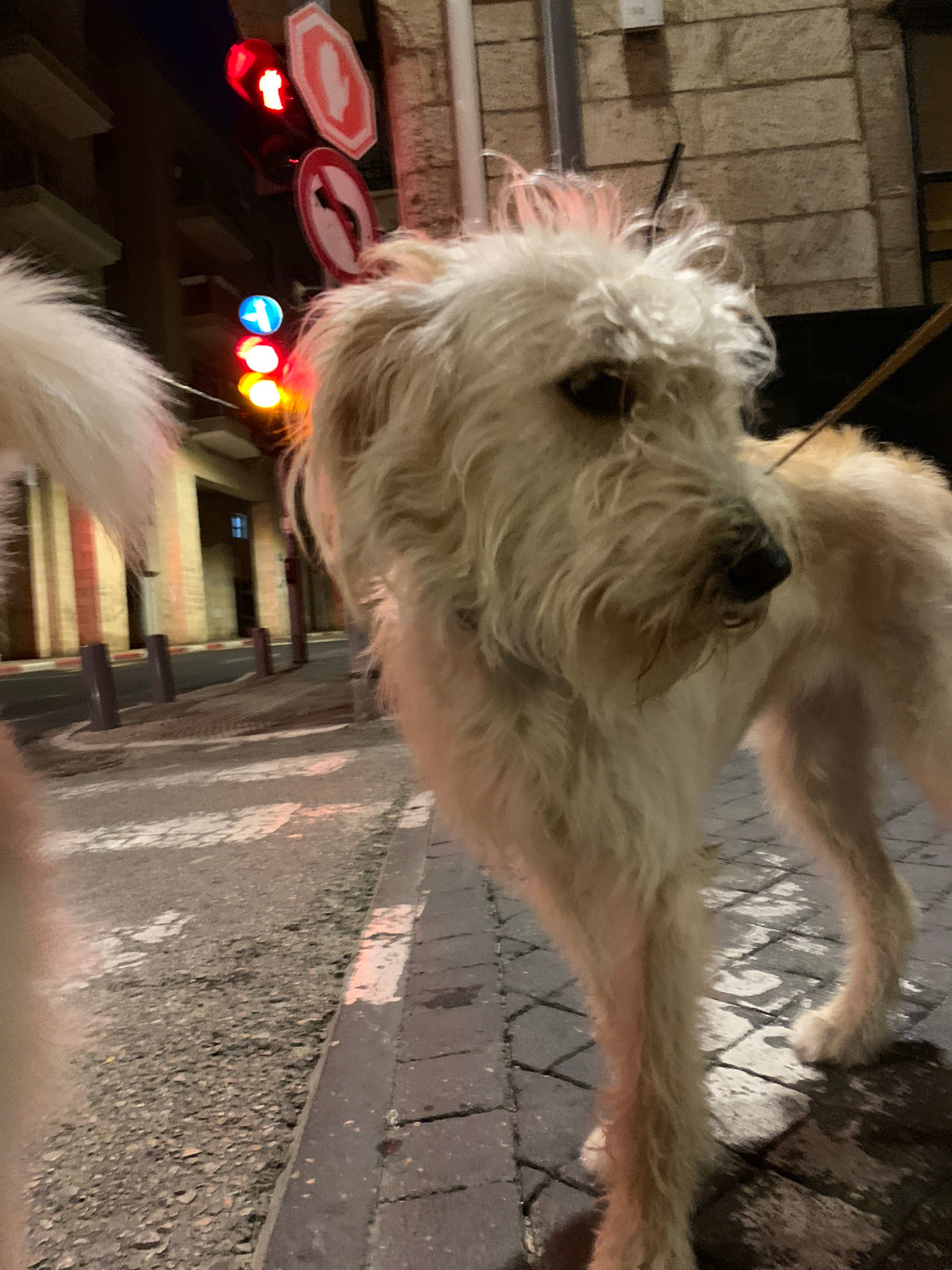 A tan-colored, long-haired dog is the prominent subject. The dog is standing on a street. The street is a crosswalk with white stripes visible. Traffic lights and road signs are in the background. The…read more