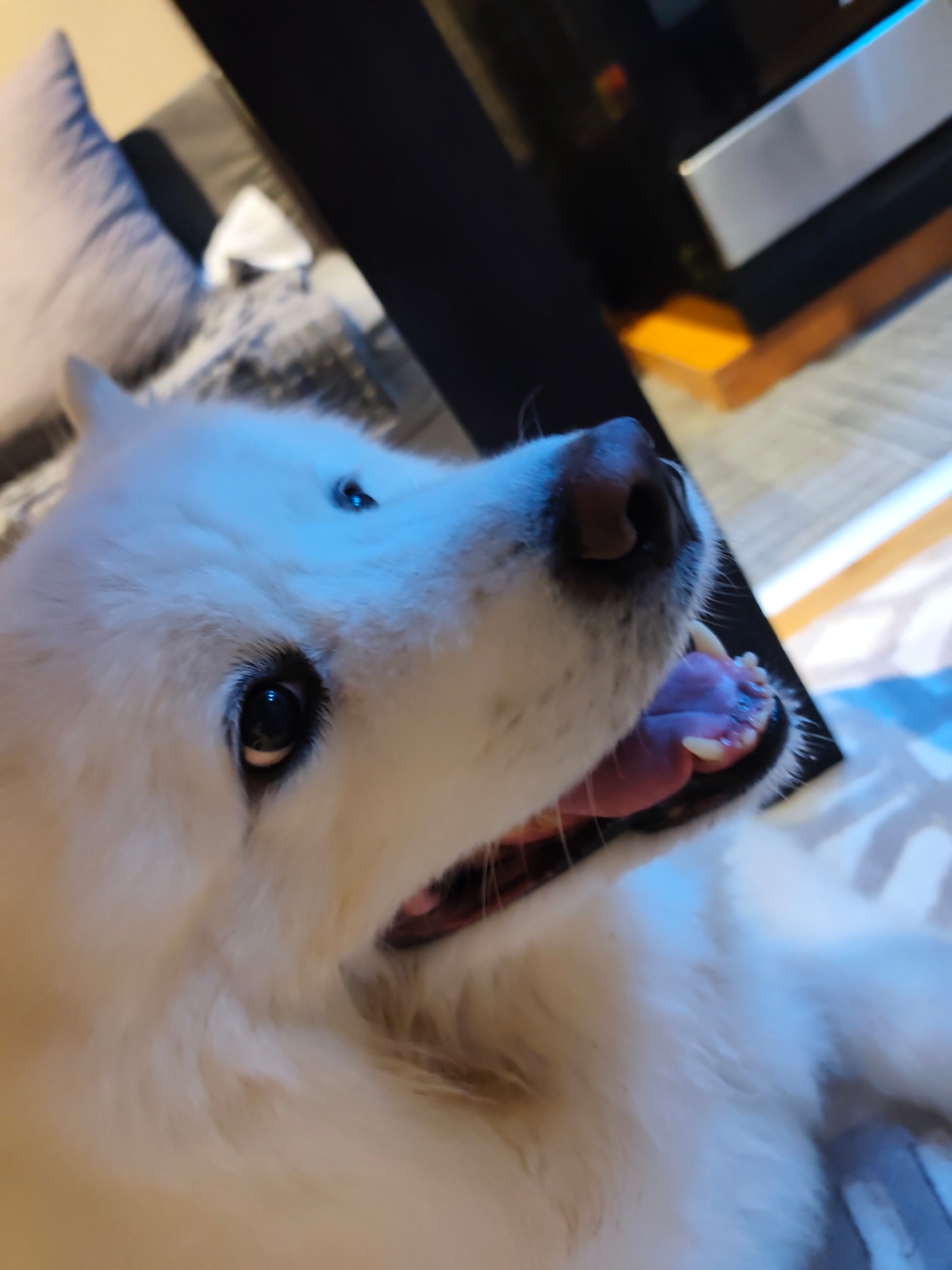 A close-up, slightly distorted view of a white Samoyed dog. The dog is lying on a surface with a gray and white patterned texture, possibly a bed or blanket. The dog's mouth is slightly open, showing…read more