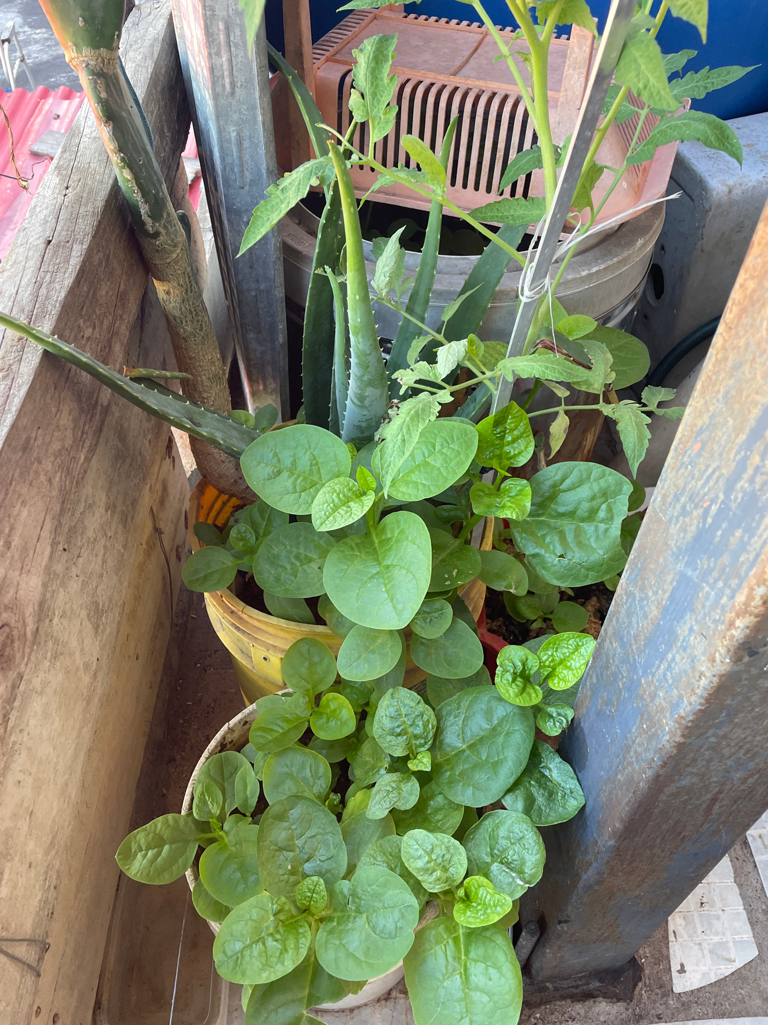 This image shows a small, urban garden setting, likely in Caracas, Venezuela. Several potted plants are visible, including tomato plants, aloe vera, and Malabar spinach. The plants are arranged on woo…read more