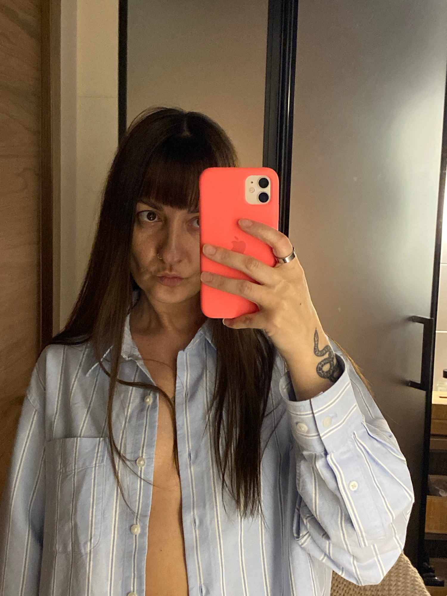 This media file captures a mirror selfie, rotated 90 degrees counter-clockwise. The central subject is a woman with dark, straight hair and bangs, whose head is positioned on the right side of the fra…read more