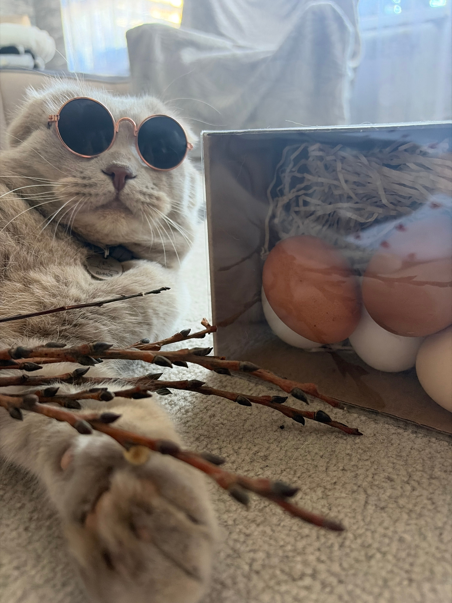 A tan cat wearing sunglasses lies near a clear plastic container holding two brown and two white eggs nested in shredded paper. Beside the cat and container are several brown twigs with buds. The cat…read more