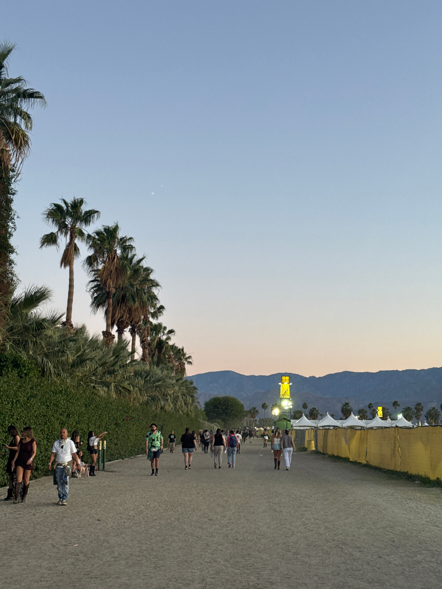 The image depicts a scene in Indio, California, United States, during what appears to be a festival or large event. A large group of people are walking on a sandy or dirt path alongside palm trees and…read more