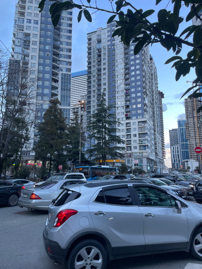The image depicts a congested urban street scene in Batumi, Georgia, likely in the modern development zone near **Sherif Khimshiashvili Street or the New Boulevard area**, indicated by the prevalence…read more