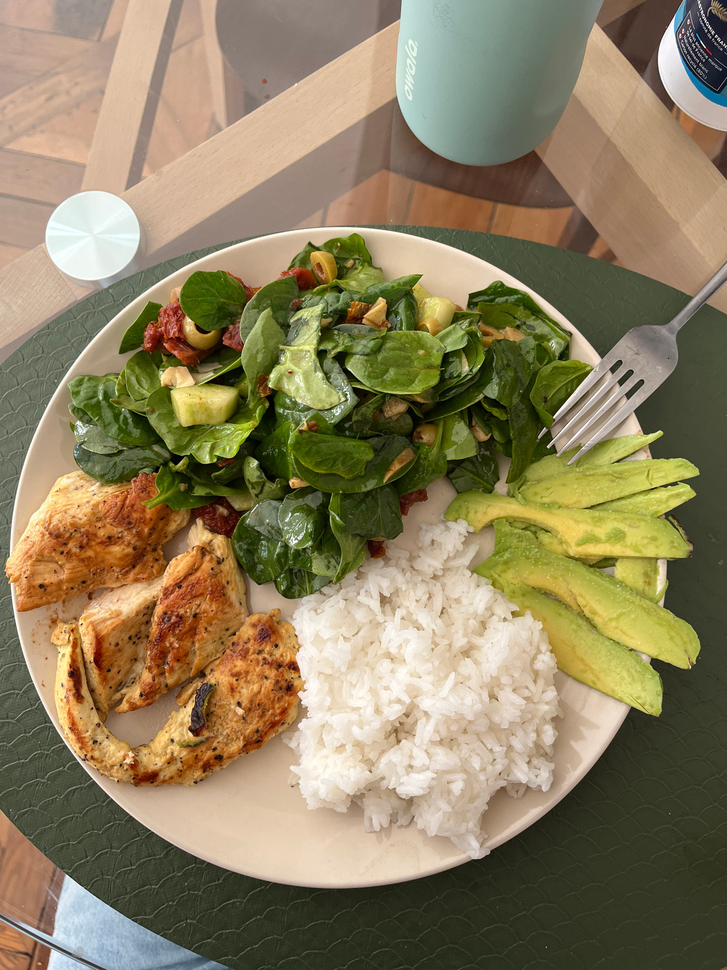 An overhead, close-up shot displays a balanced meal served on a beige plate, resting on a dark green textured placemat. The placemat is placed on a glass-top table, revealing a wooden base underneath.…read more