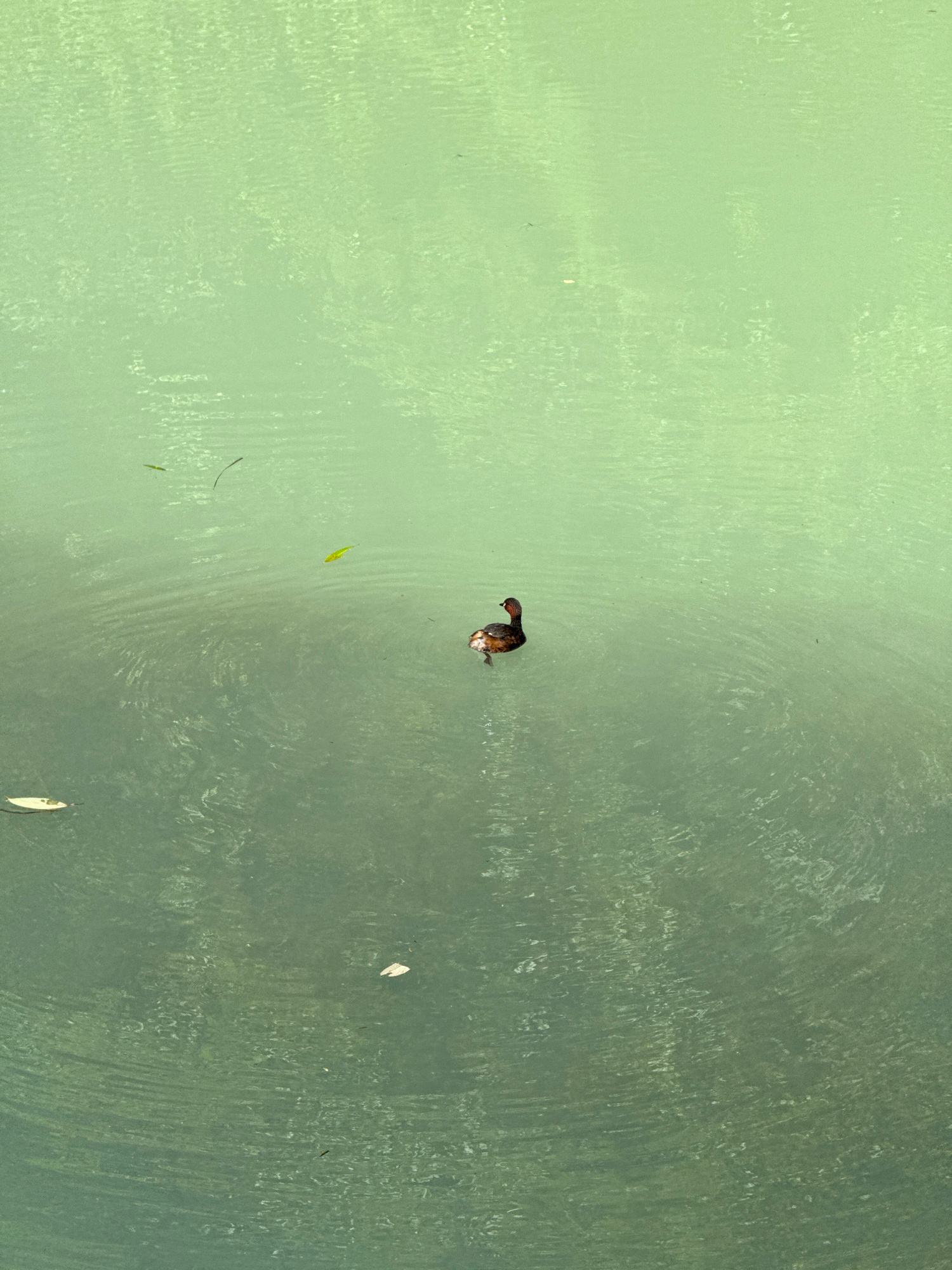 An aerial shot of a body of water, possibly a lake or pool. In the middle of the body of water is a small duck. Also visible are leaves and other debris in the water. It is unclear if the image was ta…read more