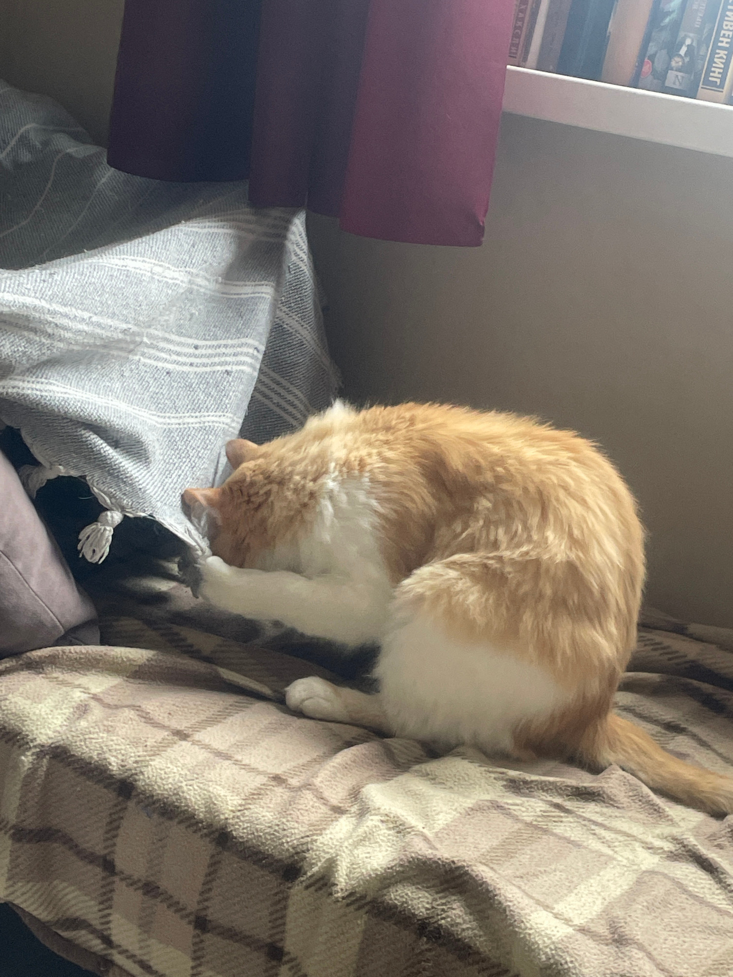 A ginger and white cat has its head buried under a grey and white striped blanket, draped over a maroon-covered object. The cat's tail is raised. Next to the cat is a brown and white plaid blanket. A…read more